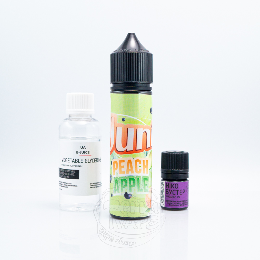 Juni Organic Peach Apple 60ml 3mg - класичне поєднання соковитого персика із зеленим яблуком і ледве-відчутним холодком.
