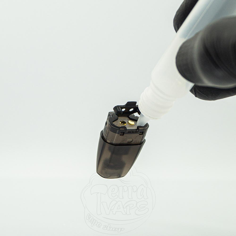 Заправка відбувається знизу. Для цього дістаньте картридж із пристрою, відкрийте пластикові дверцята в основі та залийте жижу.