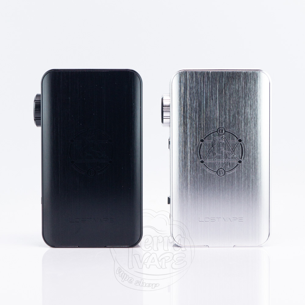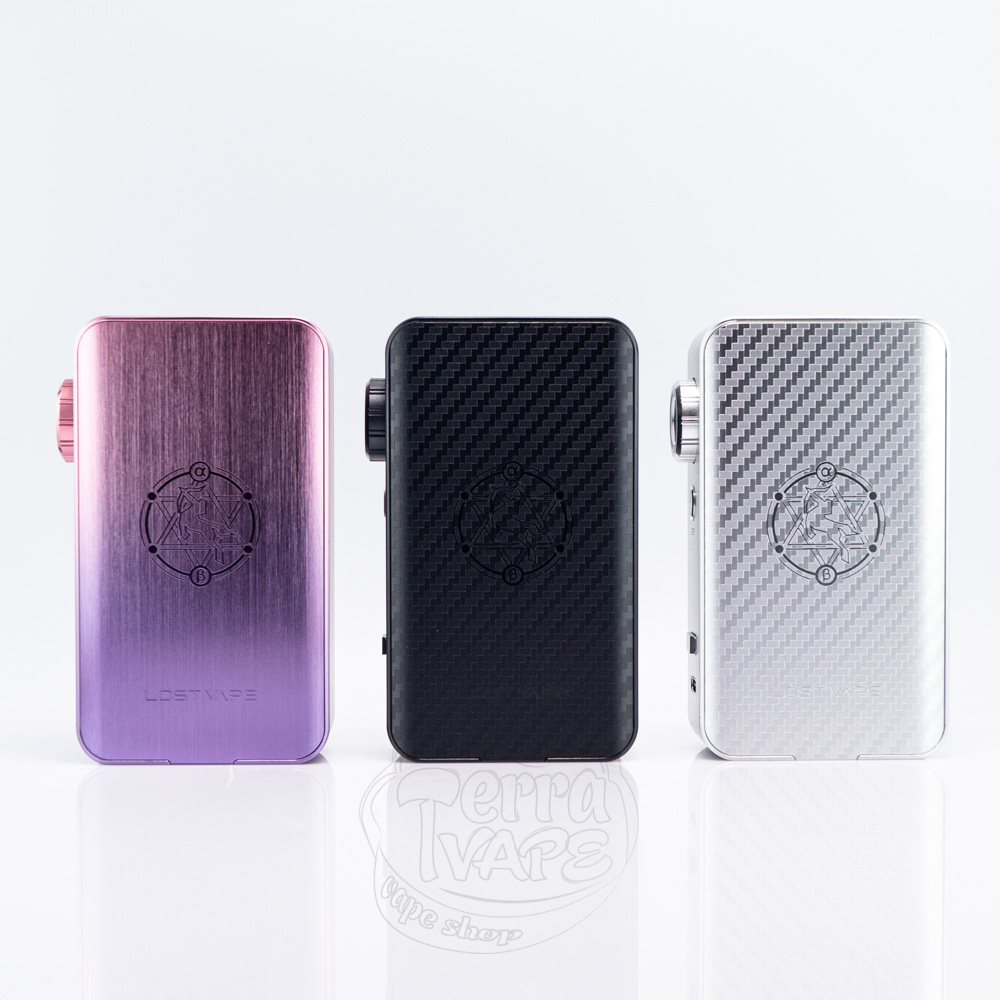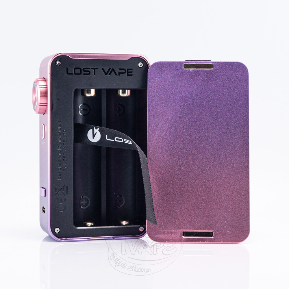 Задня частина корпусу прикрашена фірмовим логотипом Lost Vape, виконаним лазерним гравіюванням. Габарити пристрою (92,9 × 56,9 × 26,9 мм) роблять його компактним для свого класу, при цьому він зручно лежить в руці і не ковзає. Бокс-мод представлений в декількох елегантних колірних варіантах - від строгого чорного карбону до ефектного рожево-фіолетового градієнта, що дозволяє вибрати модель під будь-який стиль.