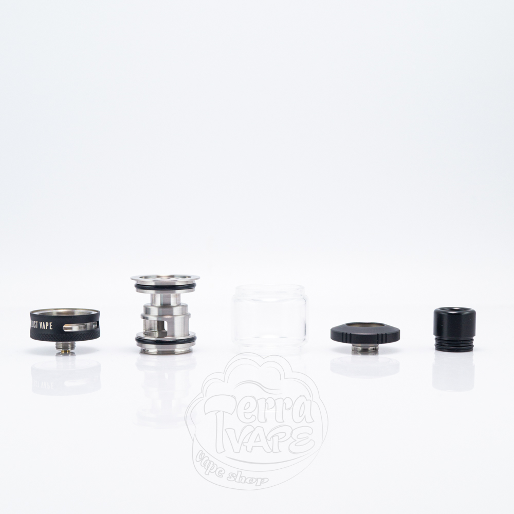 Комплектний атомайзер дуже просто використовувати, адже він працює зі змінними випарниками та не вимагає обслуговування. Це доволі невеликий бак 26мм у діаметрі з висотою 49.2мм. Знизу знаходиться кільце, за допомогою якого ви зможете налаштовувати тугість затяжки. Воно трохи вигнуто до середини, що створює ергономічну форму. Нижня частина має накатку. Об'єм резервуара складає 4мл, а скло в даному випадку прозоре, має бульбашкову форму, але не дуже випуклу.