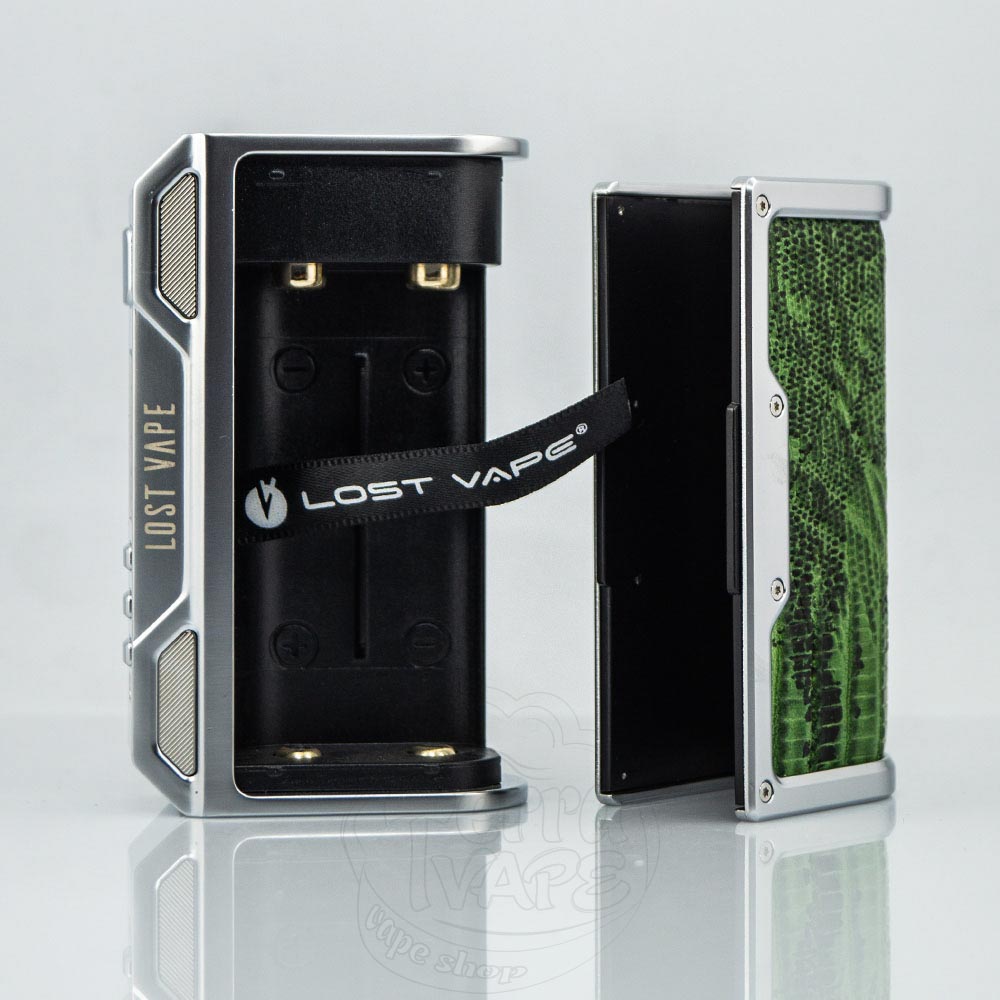 Батарейний відсік вміщує два акумулятори формату 18650 (купуються окремо). Полярність чітко позначена, і на випадок помилки бокс захищений від переполюсовки. Стрічка з назвою Lost Vape полегшує вилучення елементів живлення.