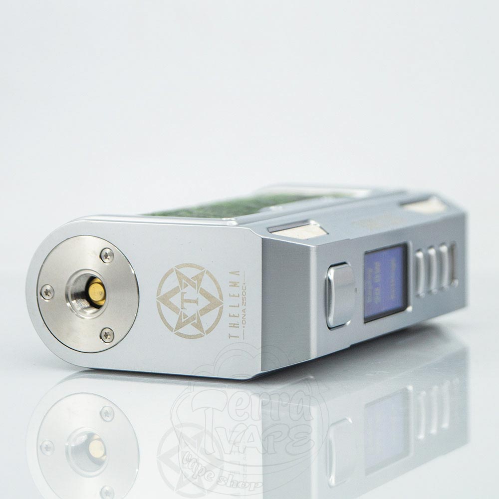 Незграбні форми сприяють стильному вигляду електронної сигарети і трохи розбивають лінії, роблячи дизайн Thelema DNA250C більш динамічним. Назва бренду також нанесена на кожну сторону екрана.