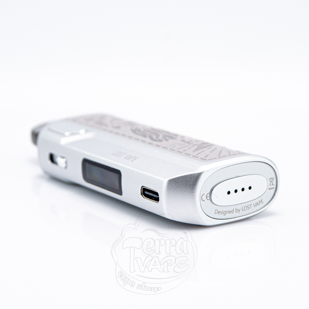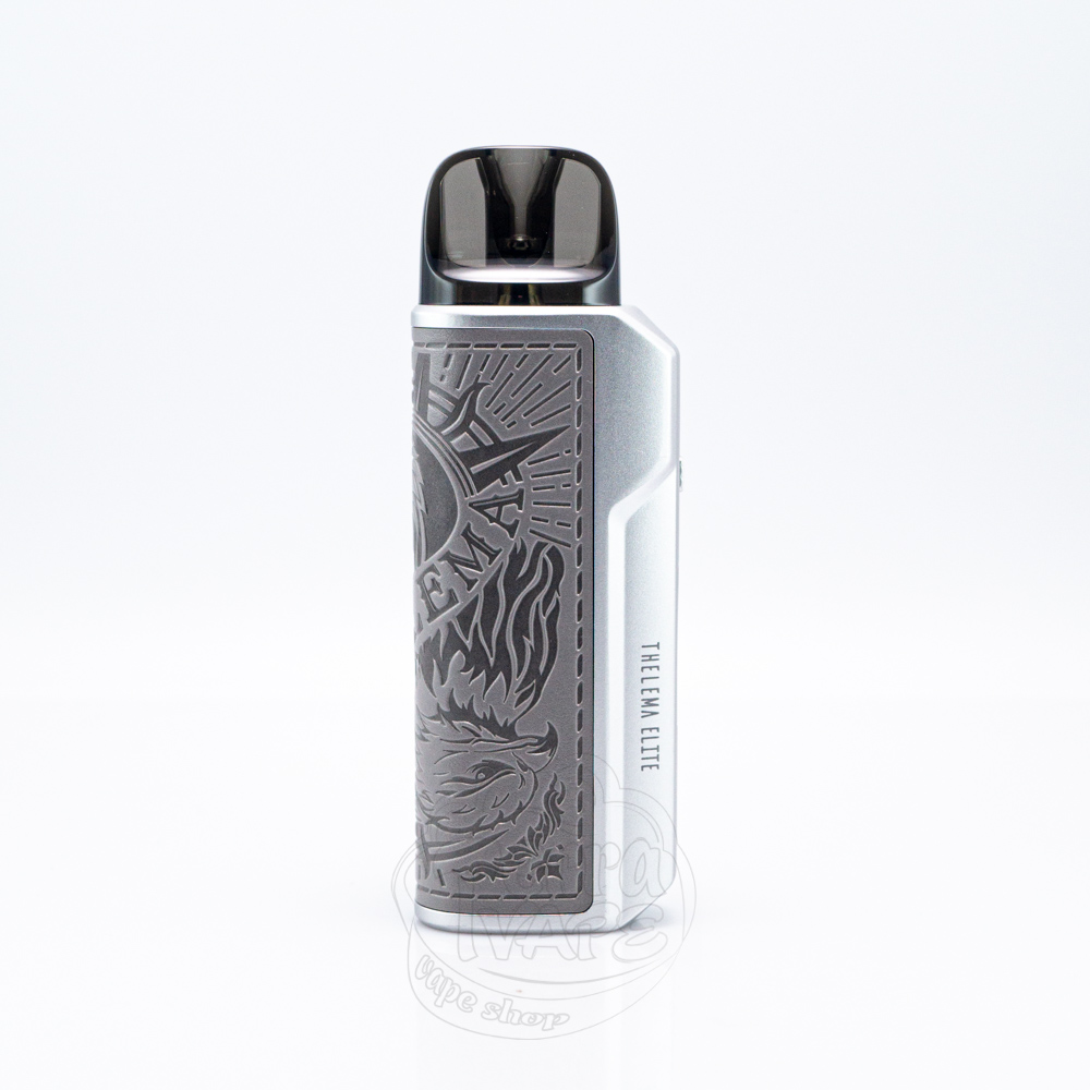 На трапецієподібному виступі розташована кнопка активації, яка повторює його форму з м'якими кутами. В заглибленні розміщений напис "Lost Vape" з одного боку та "Thelema Elite" - з іншого. На лицевій панелі знаходяться регулятор тугості затяжки, OLED дисплей діагоналлю 0.69" та зарядний порт Туре-С.