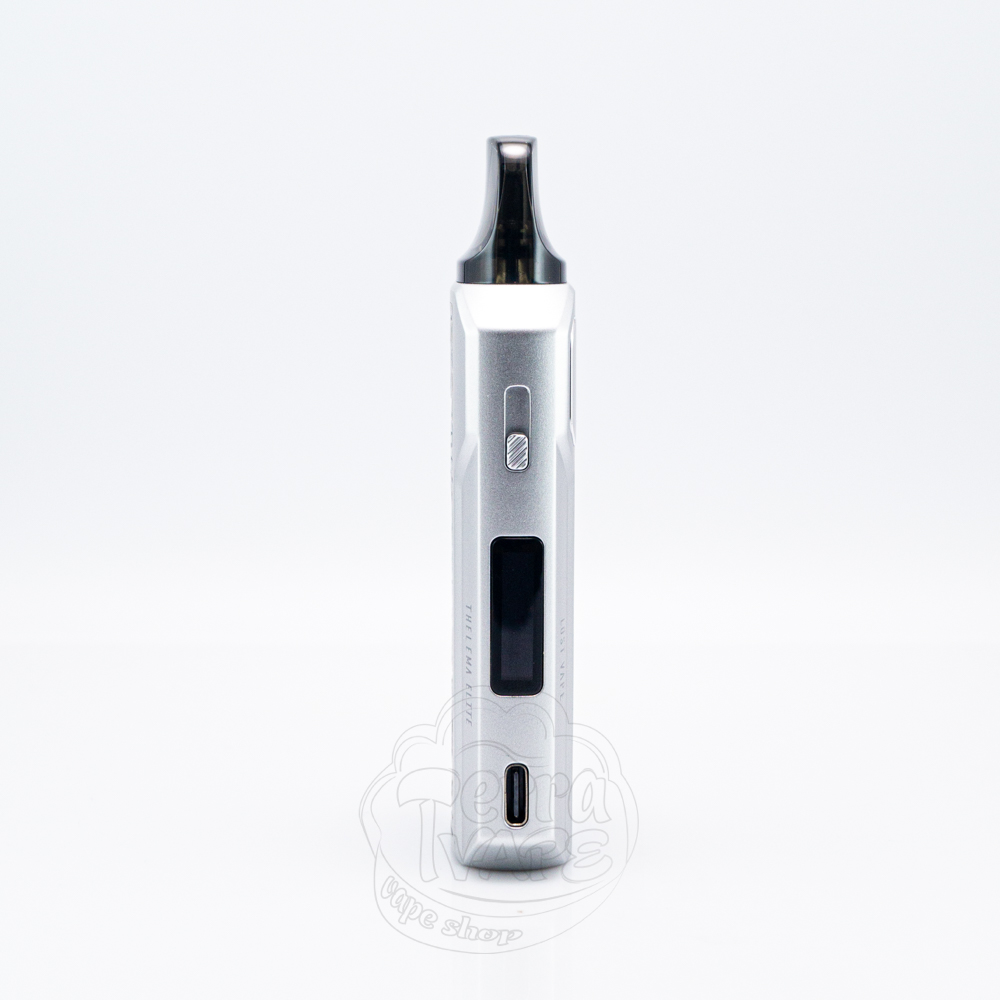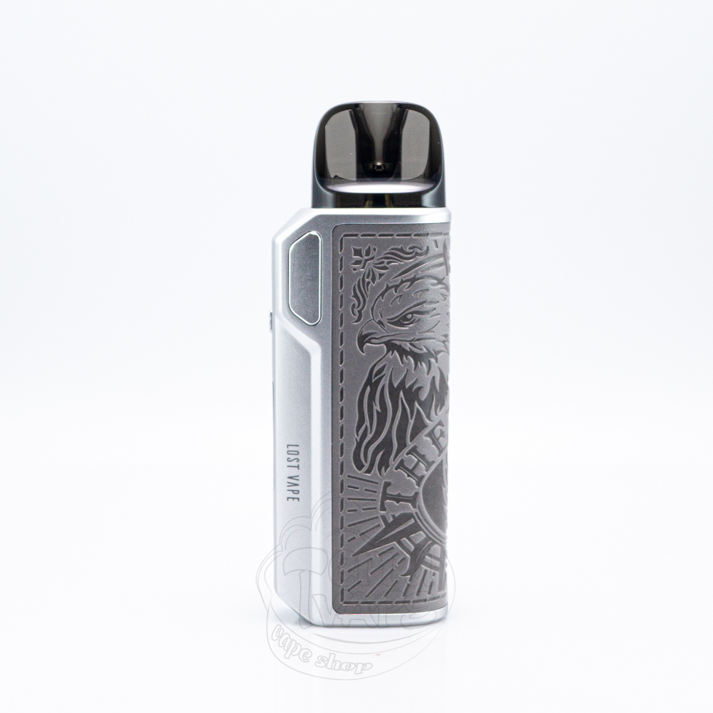 Lost Vape Thelema Elite 40 Pod Kit 1400mAh Eagle Grey - це багаторазова pod-система сірого кольору з малюнком орла, випущена компанією Lost Vape. Її робоча потужність може досягати значення 40Вт, а автономність забезпечує вбудований акумулятор ємністю 1400мАг. Активація може відбуватися як за допомогою кнопки, так і від затяжки. Невеликий 0.69-дюймовий екран допомагає зручно орієнтуватися у всіх налаштуваннях. Комплектні картриджі E-Plus мають об'єм 3мл та заправляються збоку, а тугість затяжки ви можете змінювати використовуючи повзунок. Для швидкої підзарядки електронної сигарети використовується кабель Туре-С.