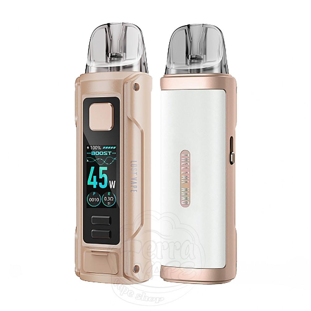 Lost Vape Thelema Nano Pod Kit 1500mAh Champange Gold - это многоразовая pod-система от знаменитой компании Lost Vape. Электронная сигарета способна поддерживать мощность до 45Вт, благодаря чему позволяет парить RDL или MTL затяжку. Питание обеспечивает встроенный аккумулятор емкостью 1500мАч. Для активации вы можете использовать кнопку или сразу делать затяжку. Большой цветной экран диагональю 0.96 дюйма поможет вам удобно и быстро выполнять все нужные настройки. Устройство поддерживает картриджи E Plus, которые вмещают 3мл жидкости и имеют боковой способ заправки. Для более точной настройки вейпинга под себя вы можете воспользоваться возможностью регулировки тугости затяжки. Также поддерживаются различные режимы работы, которые смогут предложить вам разный эффект парения. Зарядить девайс можно с помощью кабеля типа Туре-С.