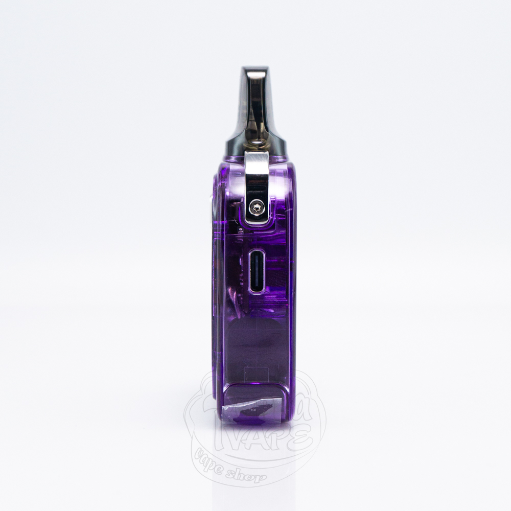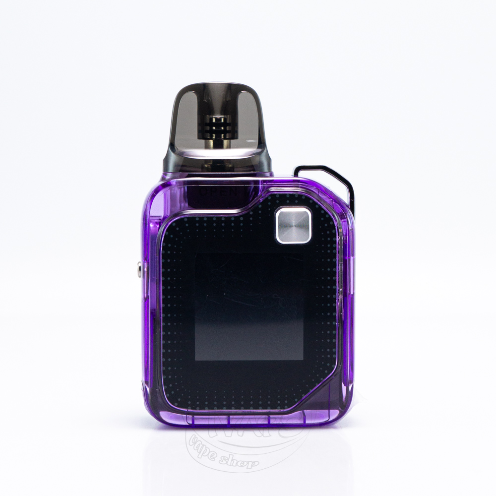 На фронтальній частині електронної сигарети розміщена чорна панель, яка повторює форму задньої накладки. На ній у правому верхньому куту знаходиться крихітна квадратна кнопка, яка призначена для активації та управління. По центру розташований яскравий кольоровий дисплей, який має розмір 1.30``. Приблизно на одному рівні навпроти один одного по обидва боки влаштувалися регулятор затяжки та зарядний порт Туре-С. Якщо дивитися з цієї сторони, то у верхньому кутку праворуч є кріплення для ремінця.