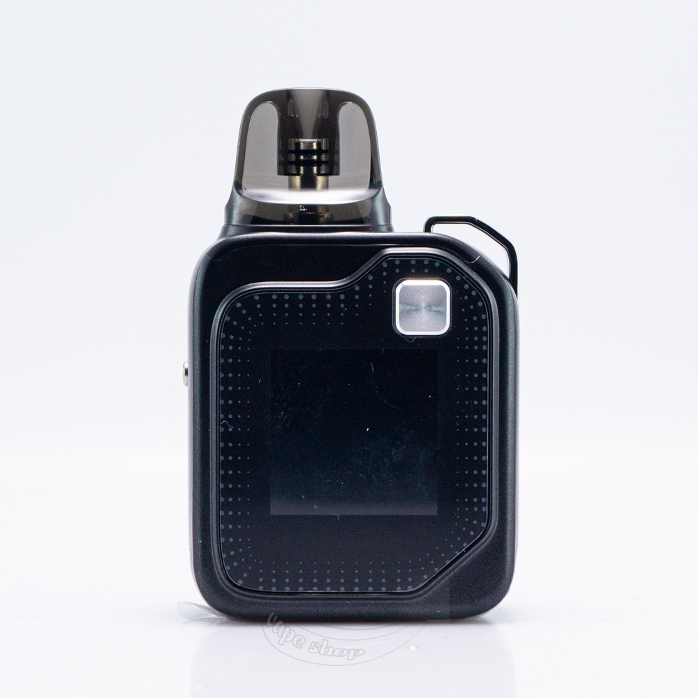 На фронтальной части электронной сигареты размещена черная панель, которая повторяет форму задней накладки. На ней в правом верхнем углу находится крошечная квадратная кнопка, которая предназначена для активации и управления. По центру расположен яркий цветной дисплей, который имеет размер 1.30``. Примерно на одном уровне напротив друг друга с обеих сторон обосновались регулятор затяжки и зарядный порт Туре-С. Если смотреть с этой стороны, то в верхнем углу справа есть крепление для ремешка.
