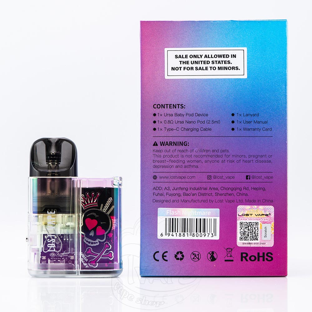 Lost Vape Ursa Baby Pod Kit 800mAh Flash Nightmare– це под-система перламутрового кольору з малюнком, продовження лінійки пристроїв Ursa від відомої своїми преміальними вейп-пристроями компанії Lost Vape. У компактну коробочку виробник встановив акумулятор на 800мАч із швидкою зарядкою Type-C. Активується від затяжки з можливістю регулювання її тугості.