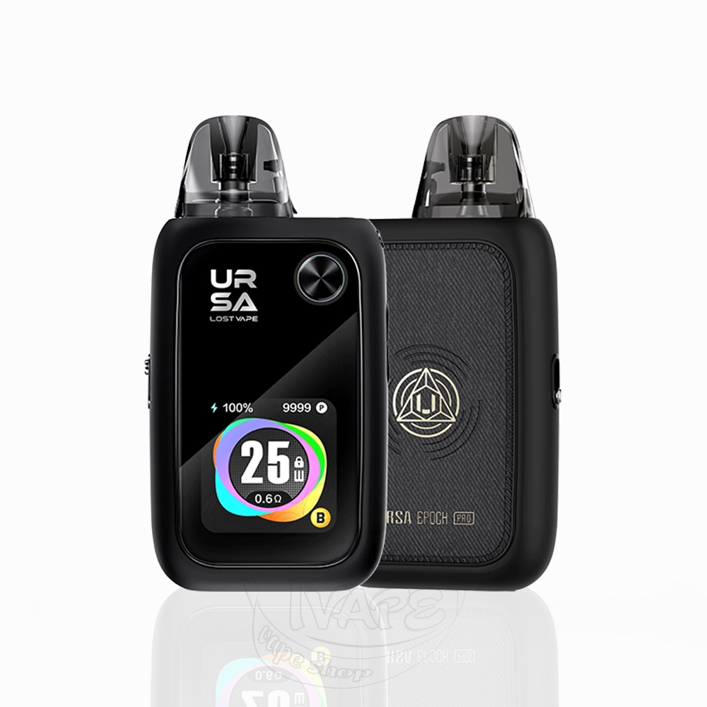 Lost Vape Ursa Epoch Pro Pod System Kit 1400mAh URSA Stellar - це оновлена версія відомого пристрою Ursa Epoch, чорного кольору зі вставкою зі штучної шкіри від компанії Lost Vape. POD-система має в собі вбудований акумулятор ємністю 1400mAh. Підтримує швидку зарядку та заряджається від порту Type-C. Максимальна потужність складає 35W. В комплекті йде з картриджем Ursa V3 об'ємом 2.5 мл та опором 0.8Ом. Сумісний зі всіма картриджами серії Урса. Активація можлива як від затяжки, так і від кнопки. Тугість затяжки регулюється невеликим слайдером. Девайс має кольоровий дисплей 1.3″ TFT, на якому відображаються всі параметри пристрою. Управління та зміна налаштувань відбувається за допомогою кнопки активації та кнопок "+" / "-".