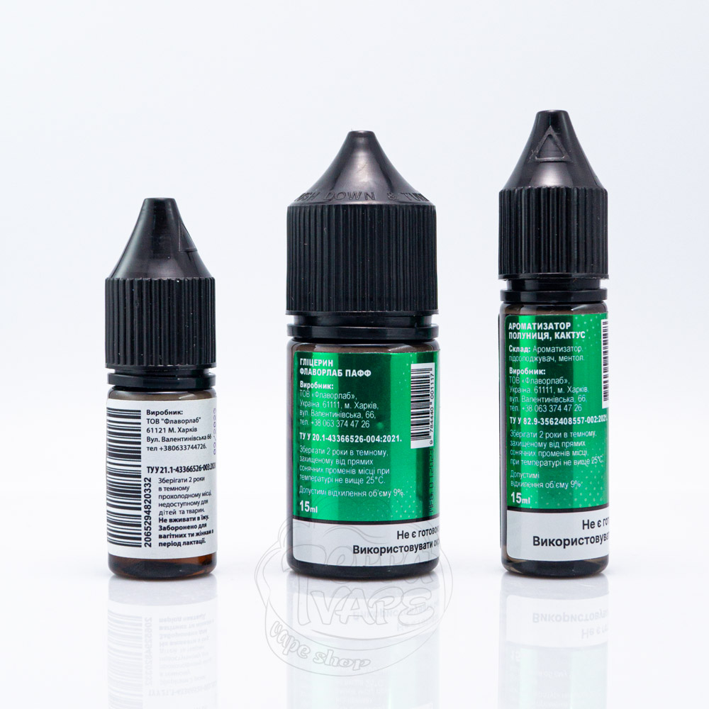 Поєднавши всі компоненти в один флакон, користувач отримує 30 мл рідини. Співвідношення пропілену до гліцерину становить 50/50, що відмінно підходить для просочення картриджів і випарників для pod-систем. Підсумкова міцність може бути: