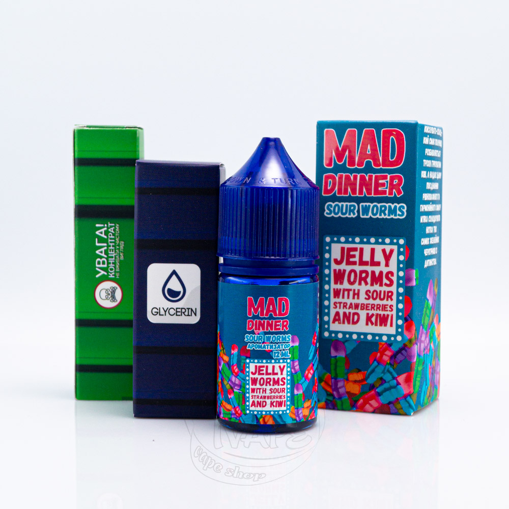 Mad Dinner Salt Sour Worms 30ml 50mg - это набор жидкости со вкусом кисло-сладких желейных червячков, тех самых, которые мы все так любили в детстве. Клубничная сладость сменяется едва заметной кислинкой киви.