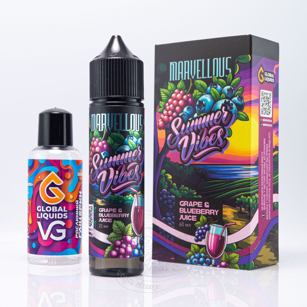 Marvellous Summer Vibes Organic Grape Blueberry Juice 60ml 3mg - це набір для замішування рідини з багатогранним смаком: солодка лохина доповнюється легкою виноградною кислинкою та приємним освіжаючим холодком.