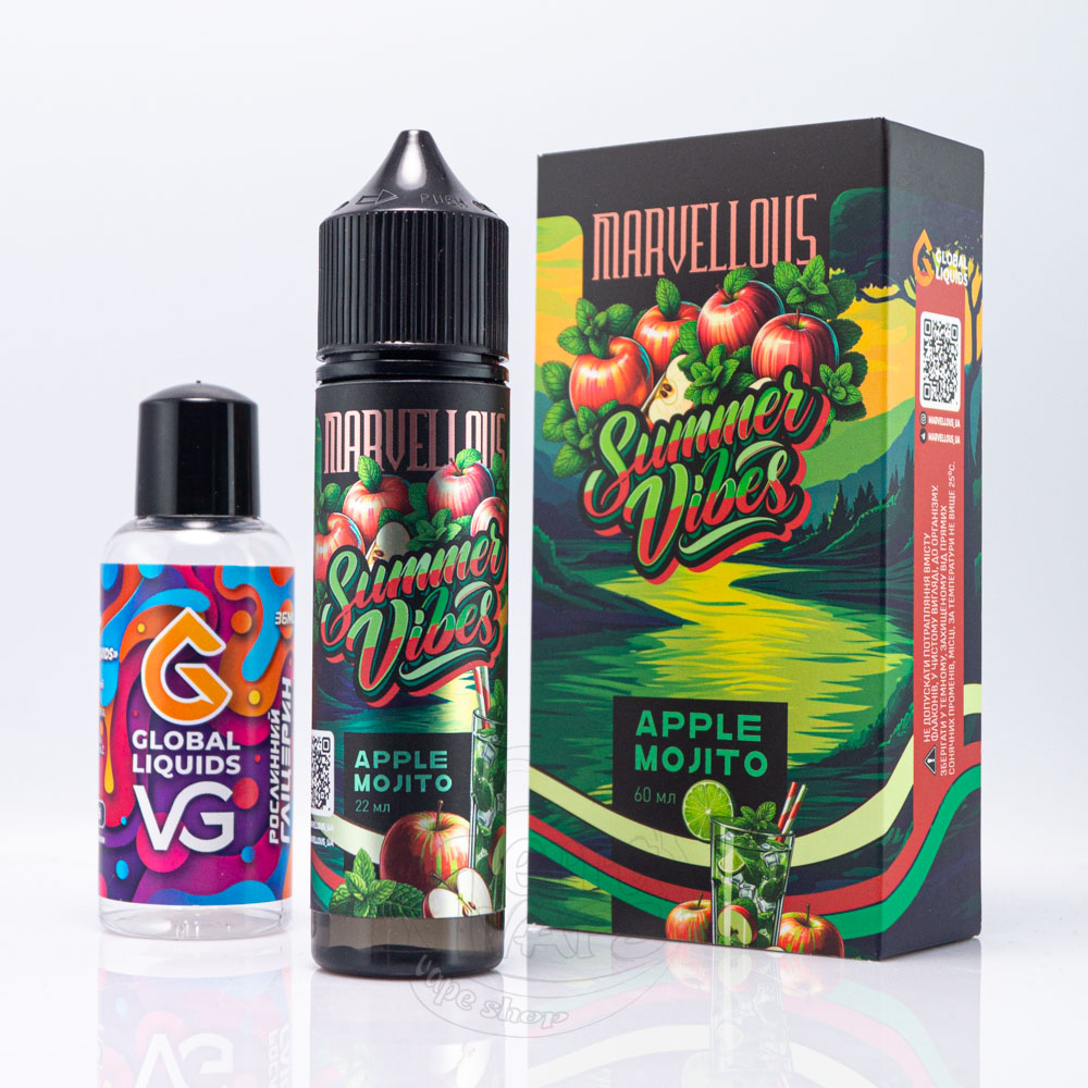 Marvellous Summer Vibes Organic Apple Mojito 60ml 3mg - це комплект для приготування рідини з освіжаючим поєднанням смаків класичного мохіто та стиглого зеленого яблука. Насичений кисло-солодкий смак з легким м'ятним відтінком.