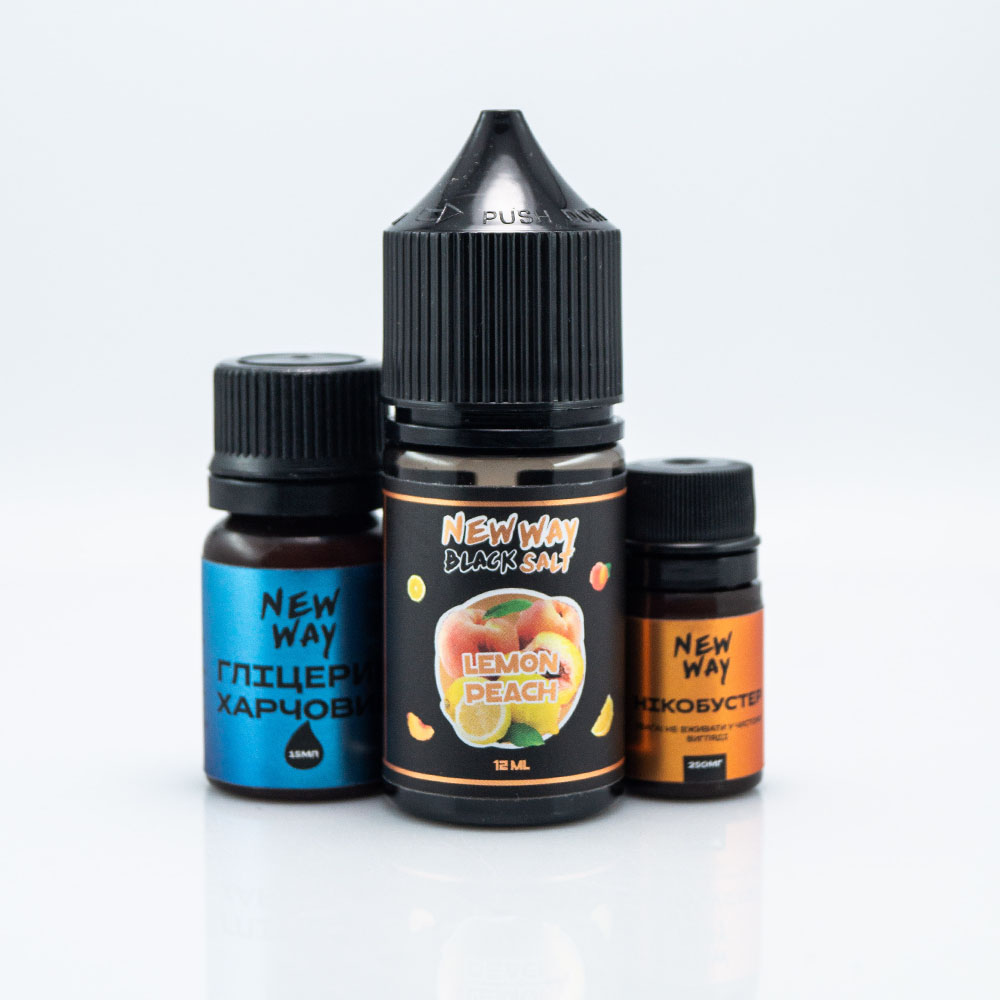 New Way Black Salt Lemon Peach 30ml 65mg - це набір для самостійного приготування жижі для електронних сигарет зі смаком стиглих солодких персиків, политих кислуватим свіжовичавленим соком лимону.