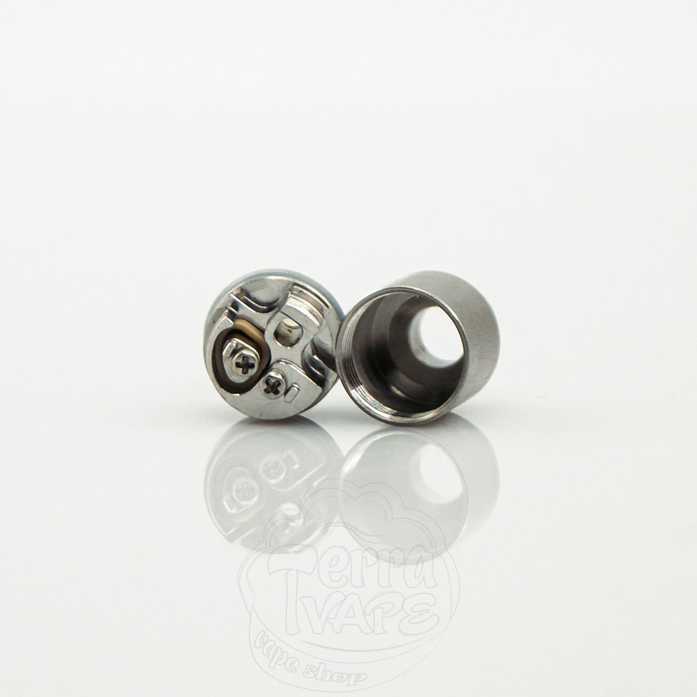 Спіраль встановлюється над обдувом, а її ніжки затискаються двома крихітними гвинтами. Важливо, щоб ніяка частина койлу не торкалася купола після збирання. Вата укладається в спеціальні пази, її кількість залежатиме від густоти рідини, яку ви плануєте використовувати (чим густіше – тим менше вати необхідно).