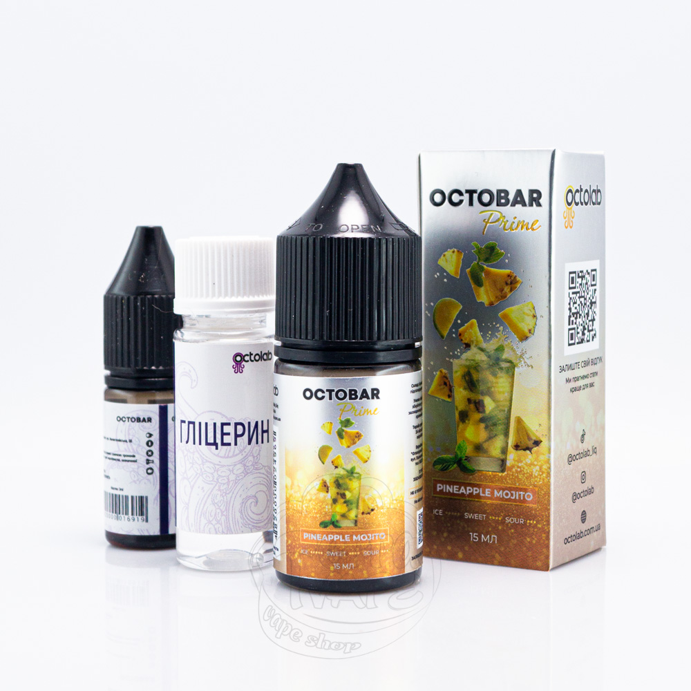 Octobar Prime Salt Pineapple Mojito 30ml 50mg - це набір солової жижі зі смаком мохіто із додаванням кисло-солодкого ананаса, який вдало поєднується з м'ятою та лаймом.