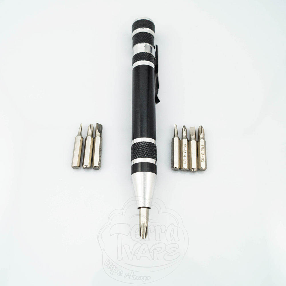 Отвертка-ручка 8 в 1 Aluminum Pen Style - набор отверток, компактно упакованный в футляр в стиле ручки. Насадки находятся внутри футляра, чтобы до них добраться, необходимо открутить верхнюю крышку. Крепятся к корпусу на достаточно сильных магнитах.