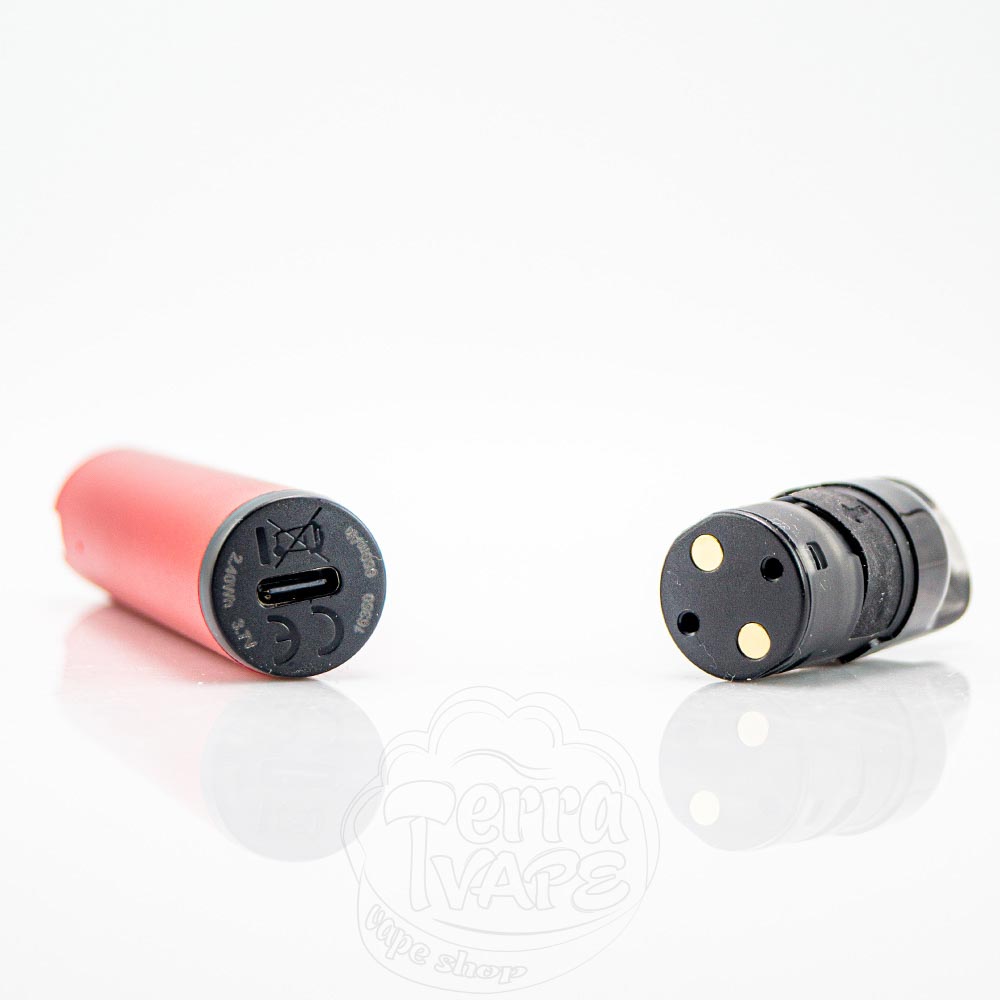 Корпус має невеликий, так би мовити, перламутровий відтінок, тобто саме покриття матове на дотик, але виглядає так, ніби внутрішня оболонка блискуча. Тут немає ніяких кнопок або регуляторів будь-чого, просто батарейний блок та картридж вгорі. На лицевій стороні пристрою розміщений логотип бренду та назва моделі, а ось зворотна частина залишається недоторканою. Під написом можна помітити невеличкий LED індикатор, а на дні знаходиться зарядний роз'єм. Верхня частина корпусу має два вирізи по боках, які призначені для встановлення картриджу та відповідають за його фіксацію.