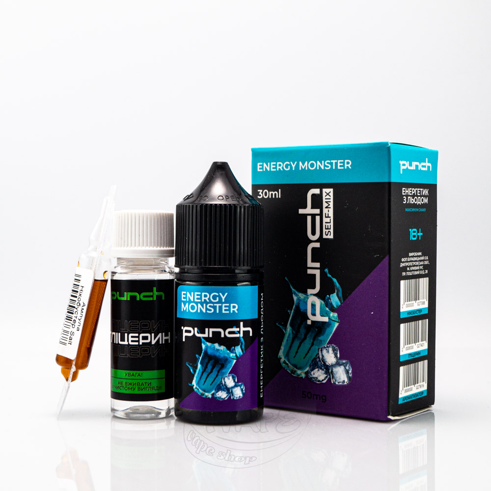 Punch Salt Energy Monster 30ml 65mg - это солевой набор для приготовления жижи со вкусом кисло-сладкого энергетика с охлаждающим эффектом. Сделав затяжку вы почувствуете, будто только что сделали глоток холодного бодрящего энергетика Монстр.