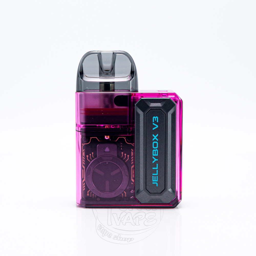Jellybox V3 виглядає як невеликий напівпрозорий бокс зі скошеними кутами. Спереду є декоративна восьмикутна накладка, на якій нанесено назву моделі. На протилежній стороні пристрою знаходиться така сама панель, але вже зі вставкою з карбону. Складно не помітити світлодіодний індикатор, який складається з декількох частин: три довгі смужки розташовані всередині великого кола на лицевій частині, а також вище можна помітити трикутник. Як вже було зазначено, корпус пода дещо прозорий, тому крізь стінки можна чітко бачити плату. Зарядний роз'єм розташований на дні електронної сигарети, тому під час заряджання краще виймати картридж для уникнення витікання рідини, оскільки девайс знаходитиметься у горизонтальному положенні.