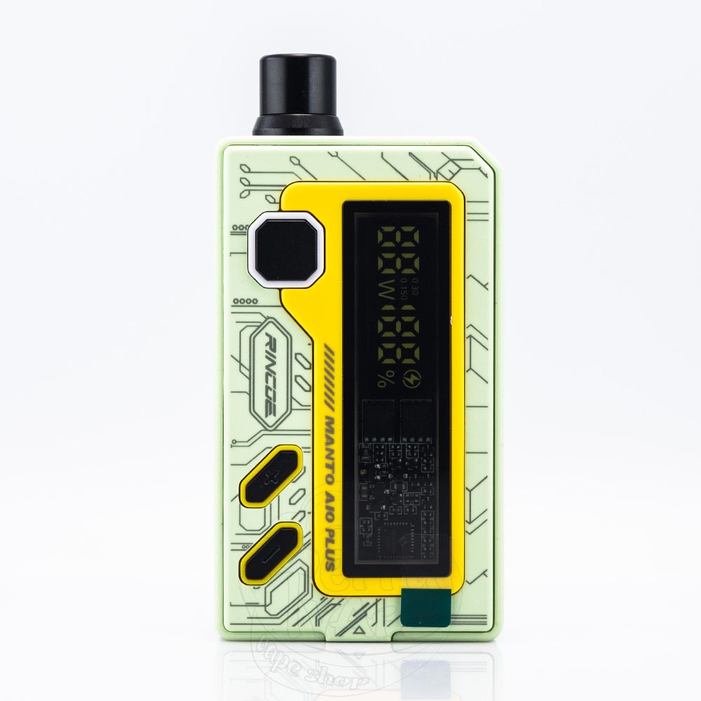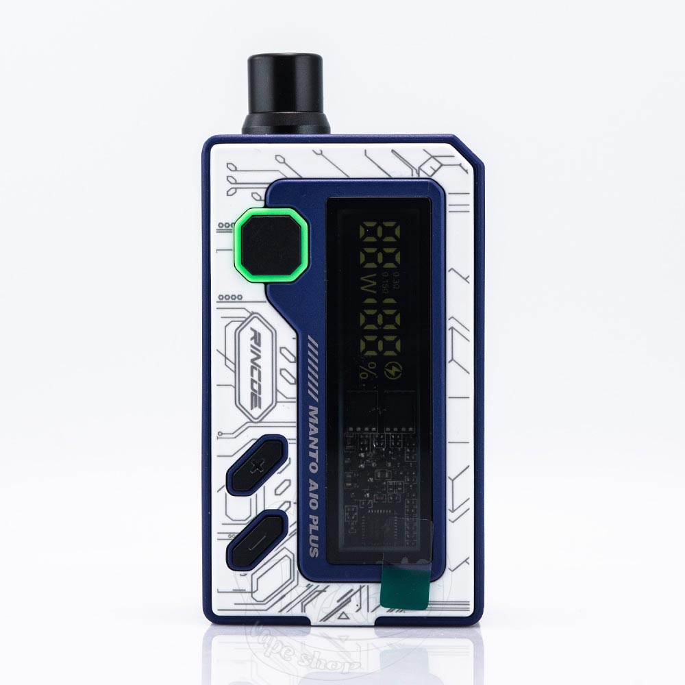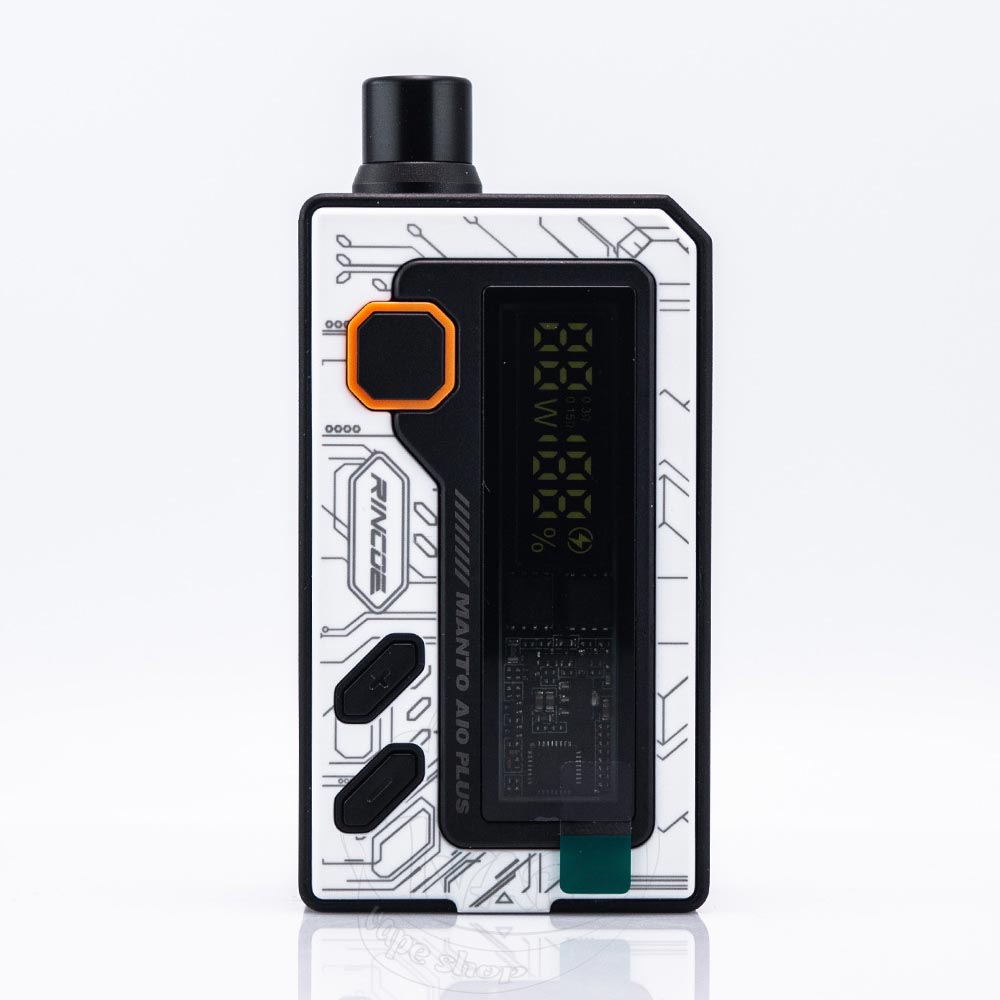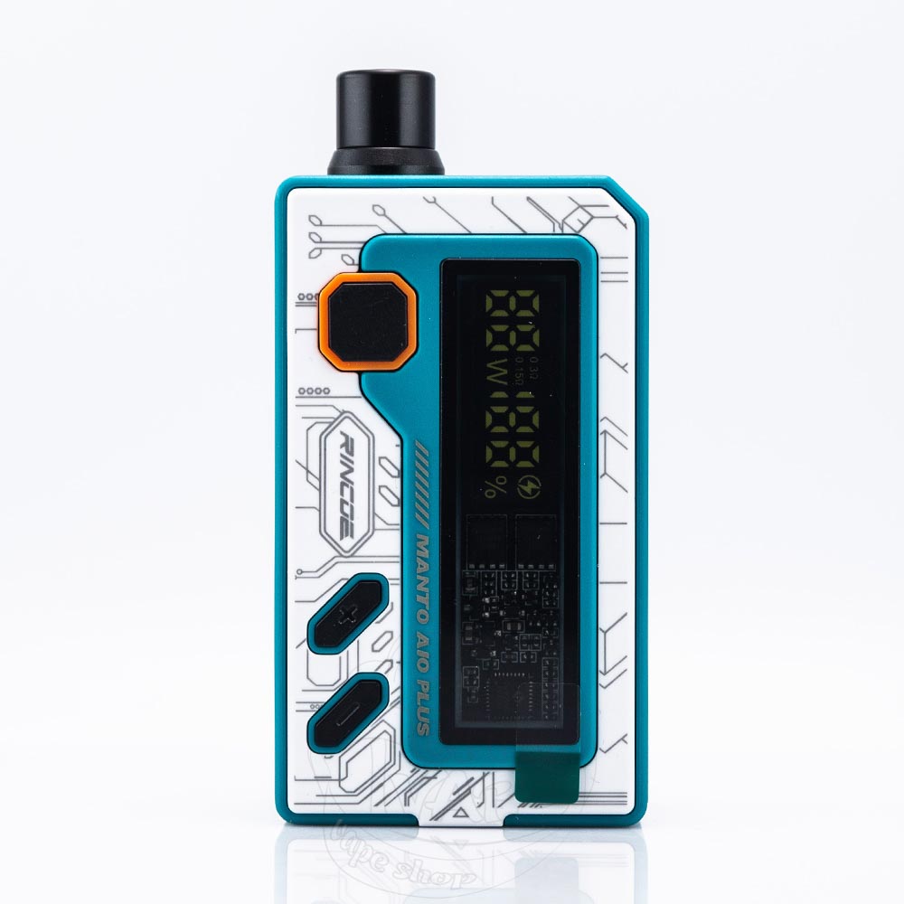 Rincoe Manto AIO Plus Pod Mod Kit - це електронна сигарета все-в-одному виробництва бренду Rincoe. Працює з картриджем на випарниках, а також є можливість використовувати обслуговувану базу, яка купляється окремо. За автономність пристрою відповідає один акумулятор 18650, який не входить у комплект поставки. Максимальна вихідна потужність, яку здатен видати Manto AIO Plus, складає 80W. Цифровий дисплей відображає всі необхідні дані для комфортного вейпінгу. Також девайс оснащений зарядним портом Type-C для живлення струмом 1A.
