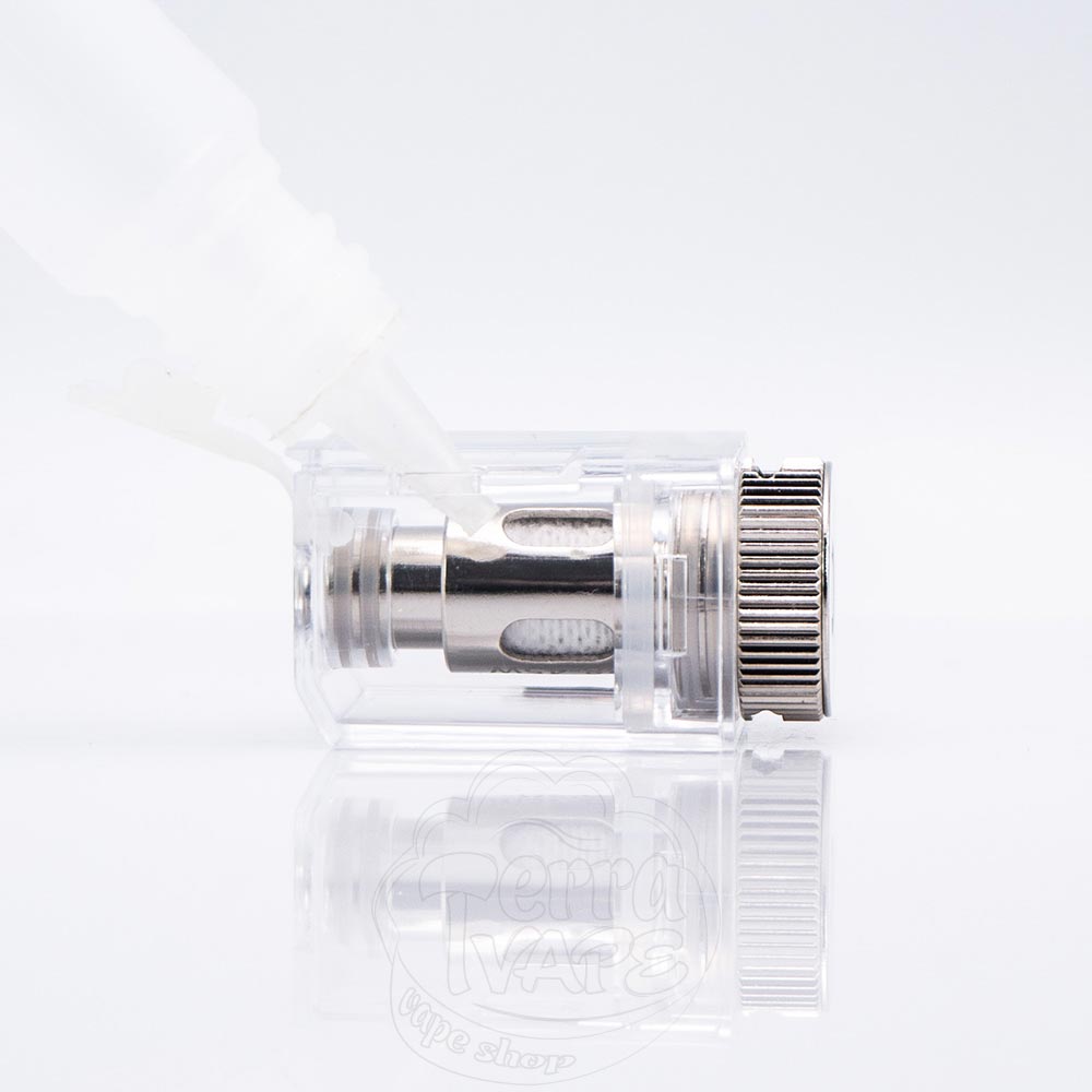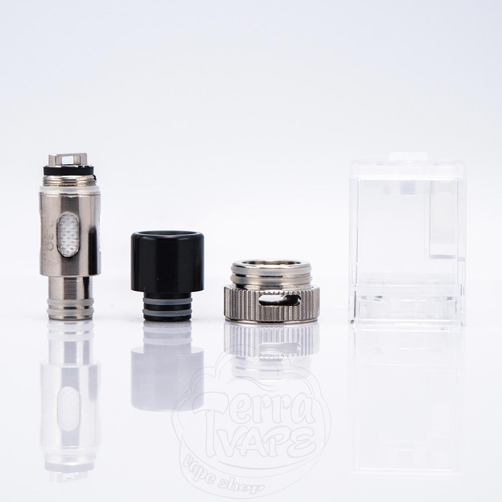 Картридж, який ви отримуєте з набору, має об'єм 3мл та легко заправляється через отвір, розташований на бічній стороні. Він виготовлений з міцного та щільного прозорого пластику. Всередині ви зможете побачити попередньо встановлений іспарік на 0.3Ом, що працює на потужності 38-45W, а також в коробку кладуть один випаровувач з опором 0.15Ом для отримання більш об'ємних та щільних хмар пари з використанням на потужності 50-60W.