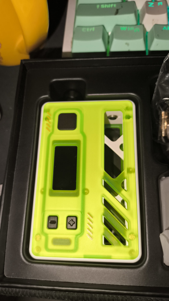 На фронтальній стороні розташована квадратна кнопка Fire, яка також має заокруглені кути. Під нею знаходиться вертикальний 0.96-дюймовий екран, а ще нижче можна помітити дві однакові за розміром кнопки, які відповідають за навігацію. У самому низу розміщений зарядний порт Туре-С.