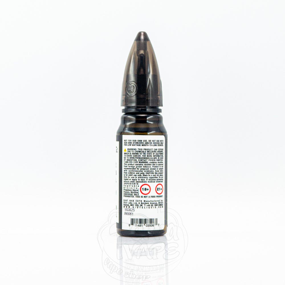 Riot squad виділяється з натовпу не тільки своїм унікальним дизайном пляшки у формі кулі або унікальними смаковими сумішами, а й зробленою на замовлення гібридною нікотиновою сольовою основою. Riot salts використовує унікальну суміш сольового і лужного нікотину, щоб отримати чудовий смак і ультрагладкий вейп.
