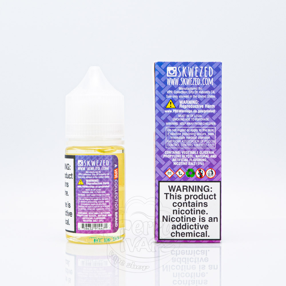 Skwezed Salt від Skwezed E-Liquid - це чудовий бренд, що базується в сонячній Каліфорнії. Рідина Сквізед стала однією з найуспішніших брендів компанії. Компанія створює високоякісну, преміальну рідину для вейпа, яка пропонує незвичайні смаки. Тоді як конкуренти наголошують на створенні занадто складних смаків, Skwezed зосередився на простих, але доведених до досконалості смаків. Виділяючись на тлі інших, вони стали провідним вейп-брендом у галузі.