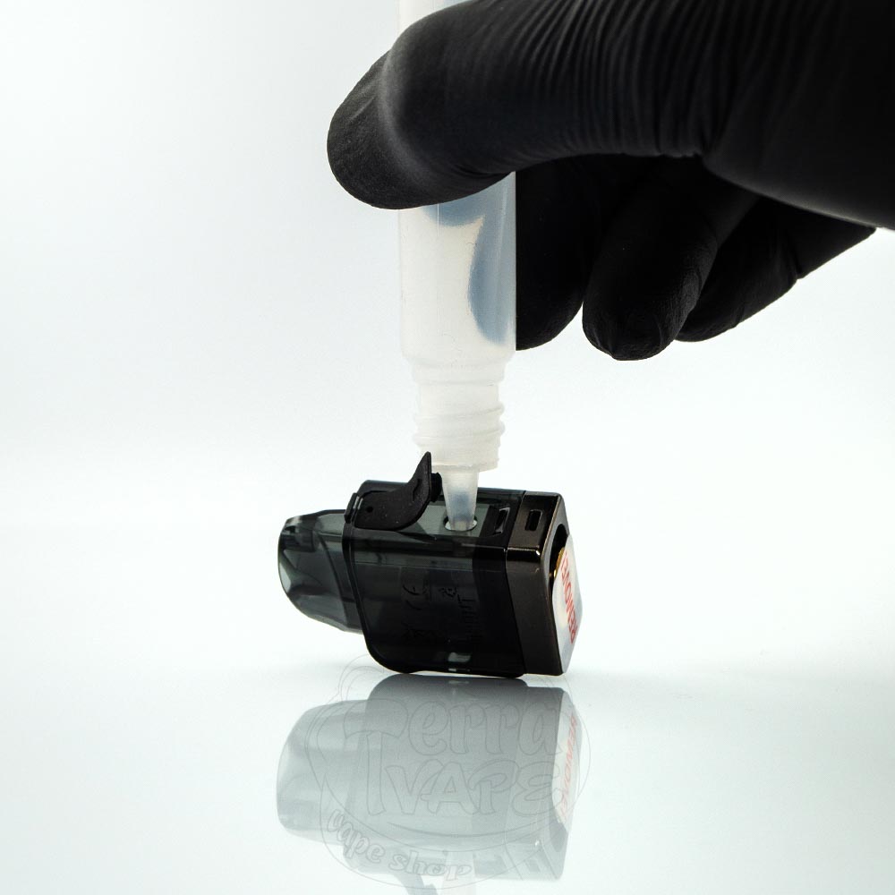 На протилежному боці від слайдера розташувалася гумова заглушка, відкривши яку ви отримуєте доступ до отвору для заправки. Залийте рідину всередину і зачекайте 10-15 хвилин, поки випарник якісно просочиться.