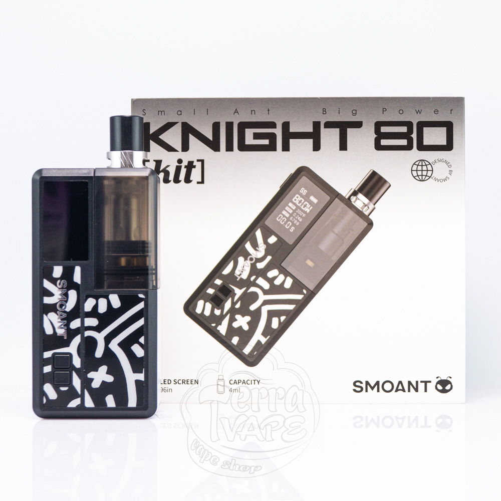 Smoant Knight 80 Pod Mod Kit Baroque White – це под мод в чорному корпусі з білою абстракцією від компанії Smoant. Працює на знімному акумуляторі формату 18650 з максимальною вихідною потужністю 80Вт. Картридж із змінними випарниками має ємність 4мл. Активується від кнопки. Тугість затяжки та потужність регулюється. Відмінний стартовий набір для новачка.