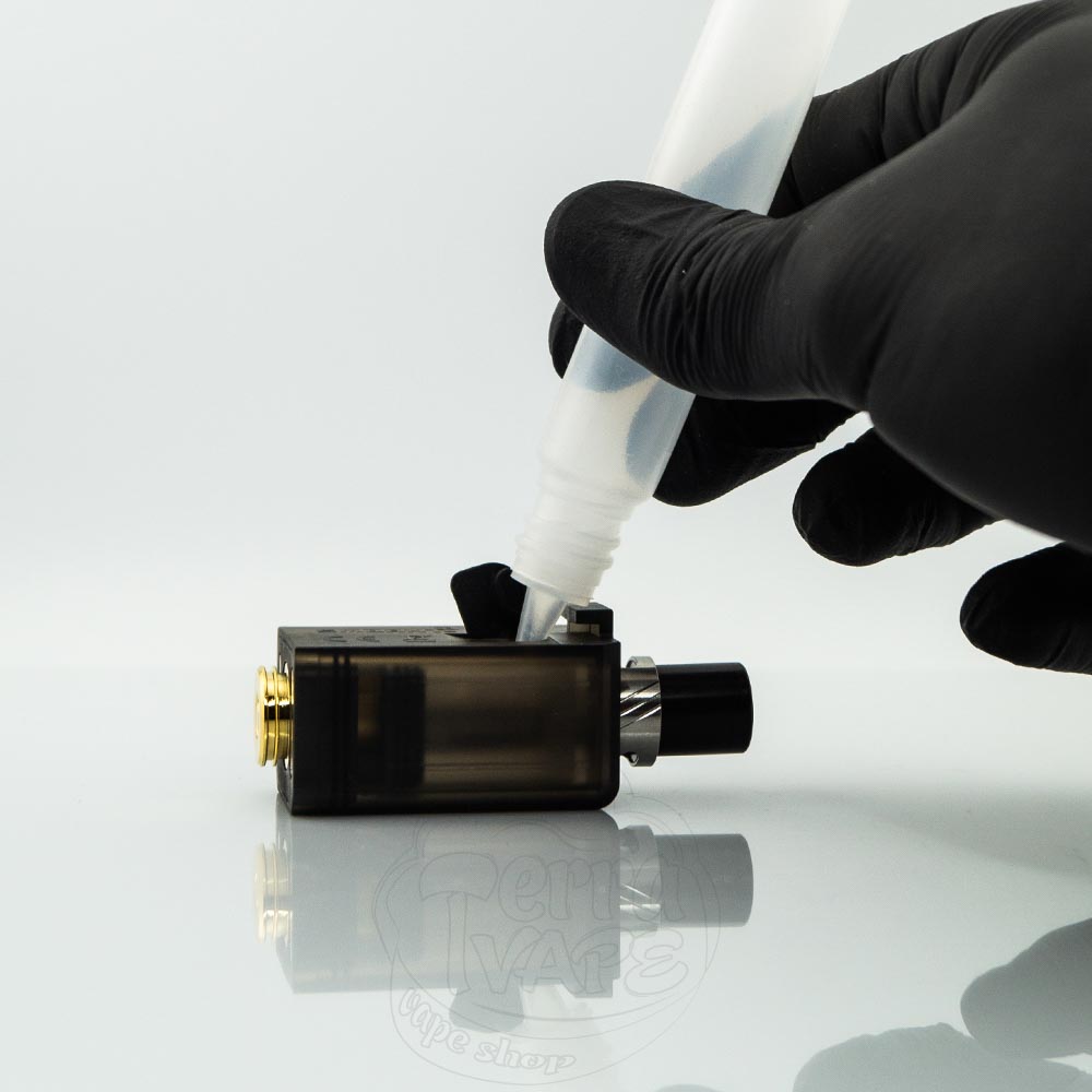 Достаньте картридж из девайса, откройте резиновую заглушку и залейте жидкость внутрь. Закройте заглушку и подождите 10-15 минут, чтобы вата в испарителе хорошо пропиталась.