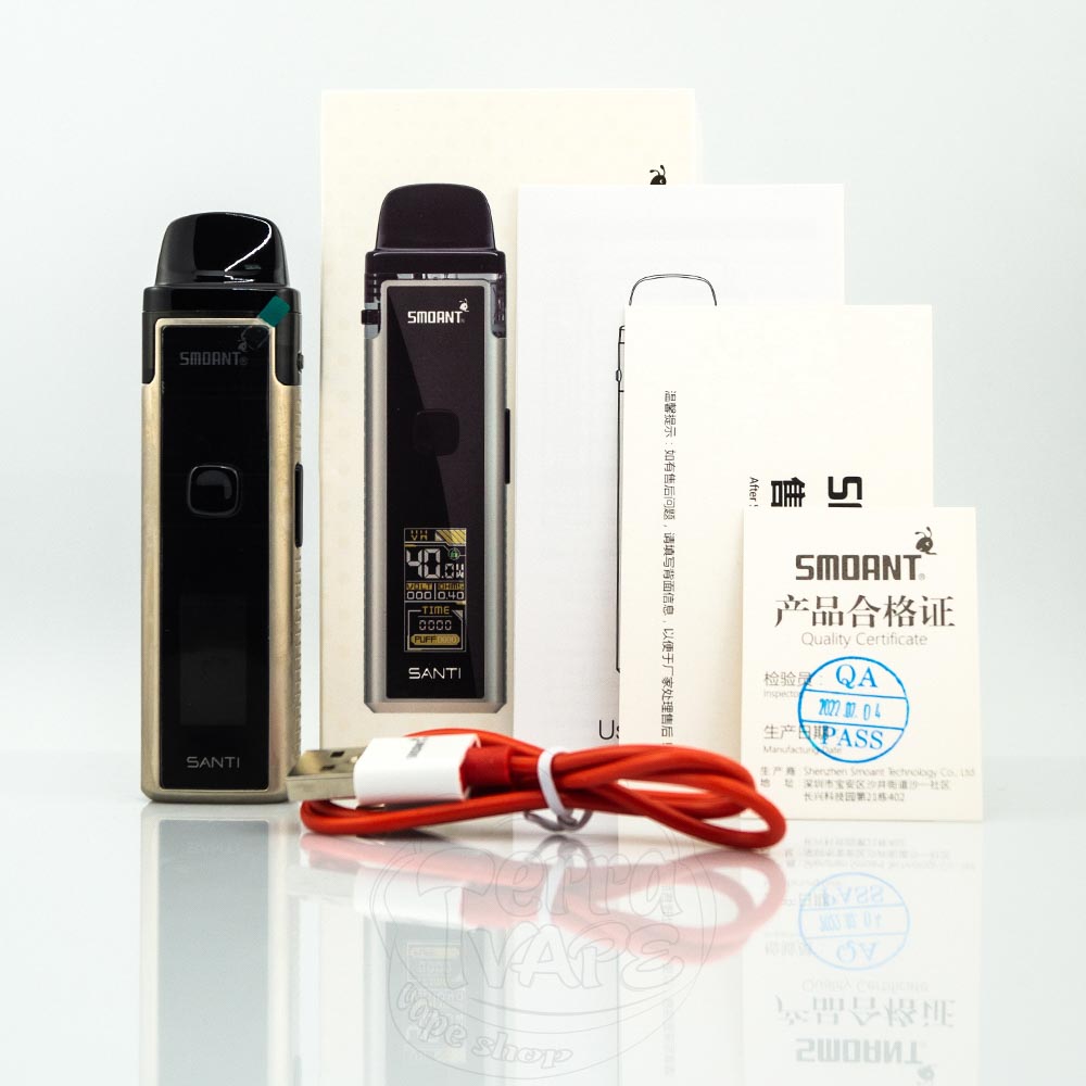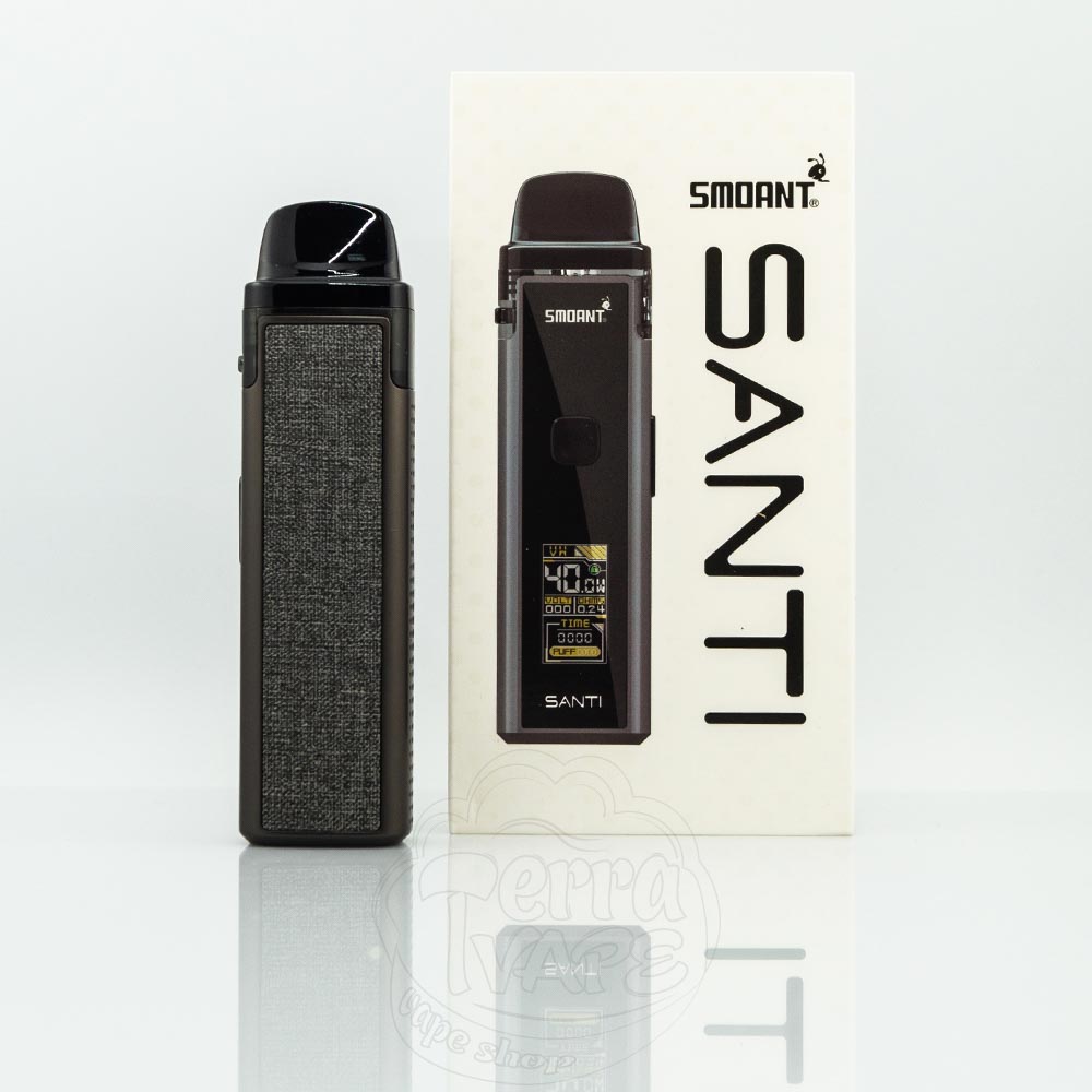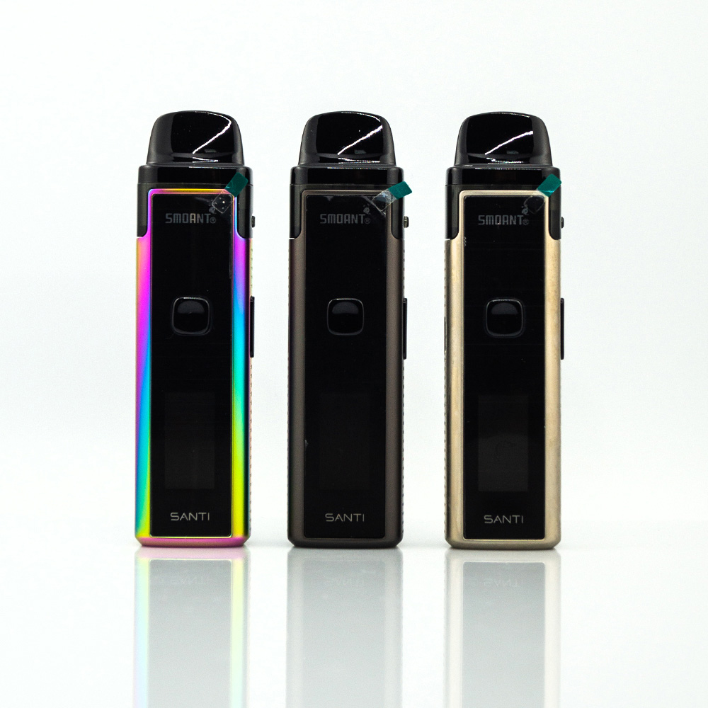 Smoant Santi Kit Pod System Kit – це под система від компанії Smoant. Активується від кнопки. Вбудована батарея на 1100мАч із швидкою зарядкою Type-C. Потужність регулюється (максимальна 40W). Картридж зі змінними випарниками, підходить для вільної та сигаретної затяжки.