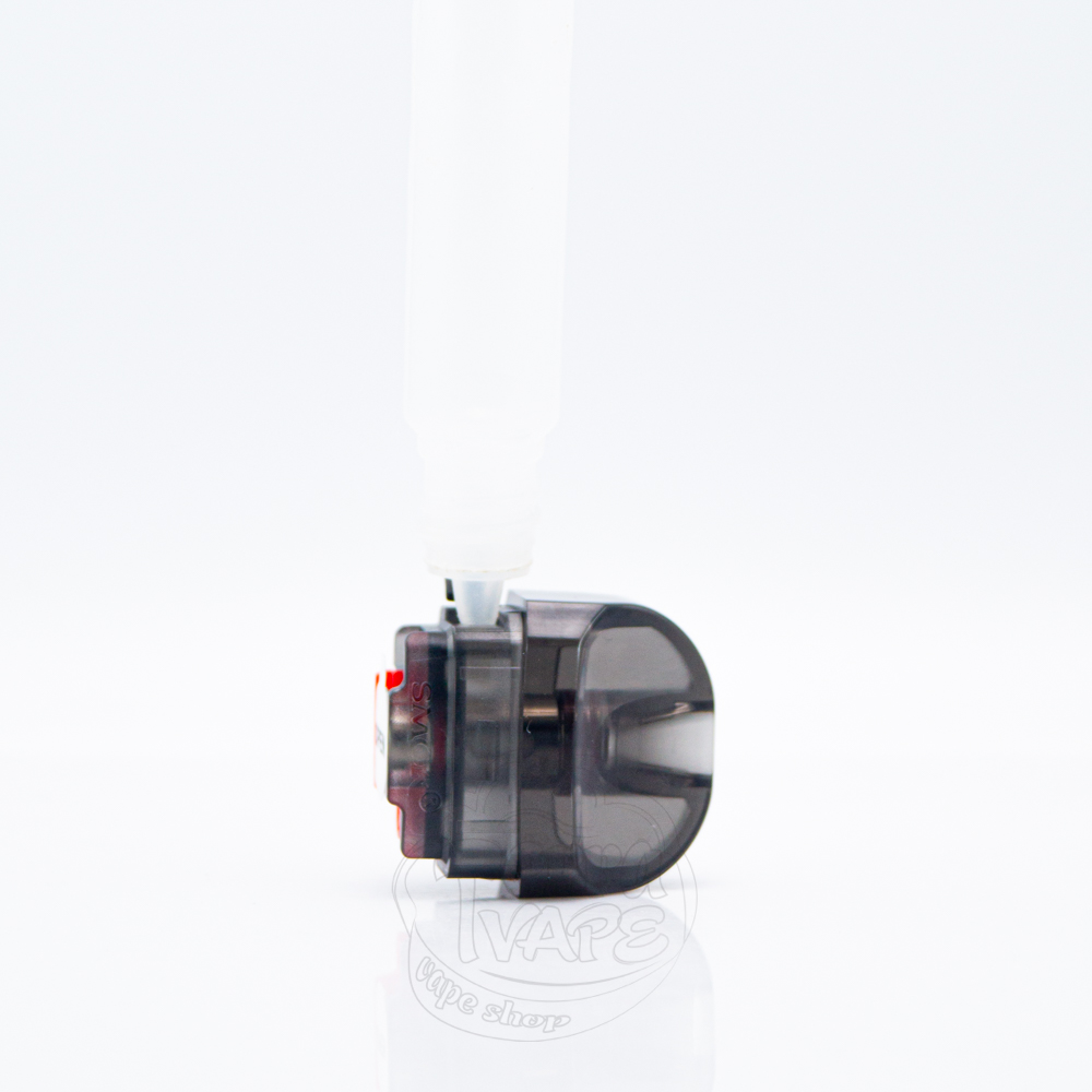 Картридж об'ємом 5мл надійно тримається магнітами у верхній частині вейп-пристрою і має фіксатор червоного кольору, який утримує випарник на місці, а також зменшує вірогідність витоку рідини. Збоку знаходиться великий отвір для заправки, захищений силіконовою заглушкою. Незважаючи на доволі об'ємний розмір, мундштук має ергономічну форму і комфортно лягає на губи під час використання. Щоб заправити картридж, вам достатньо лише від'єднати гумову заглушку та заповнити ємність рідиною для електронних сигарет, після чого закрити заглушку.