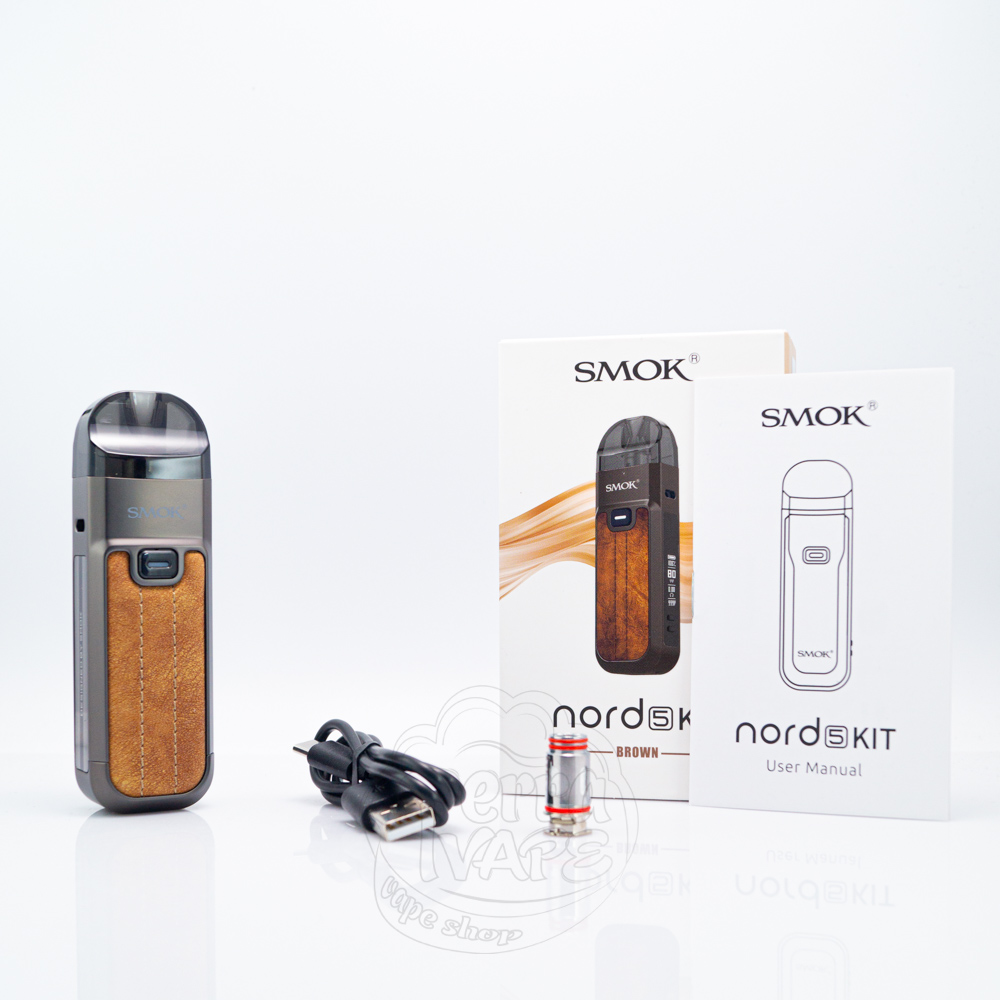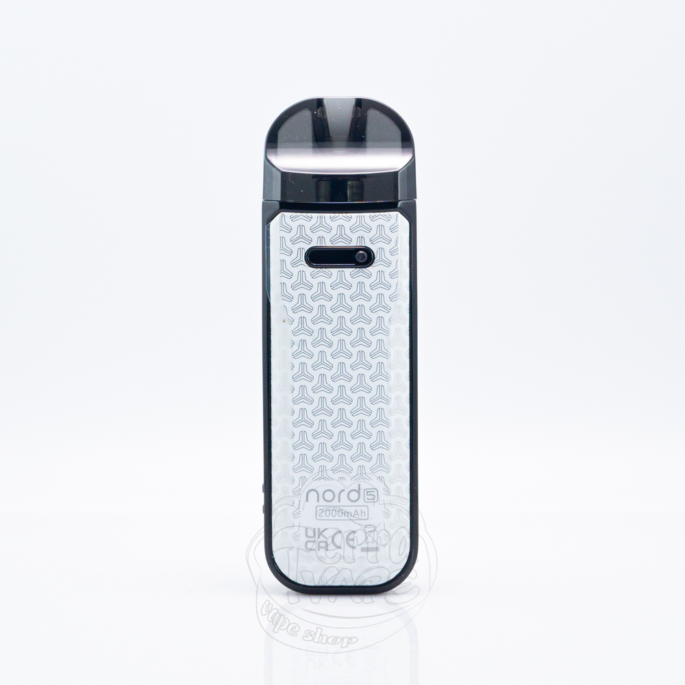 На передній частині пристрою надруковано напис "Smok", а на кожній з бічних сторін корпусу є широкі отвори для забору повітря. На задній панелі розміщений брендинг з назвою моделі "Nord 5", а також відповідні знаки безпеки. На дні основи розташовано зарядний порт Type-C.