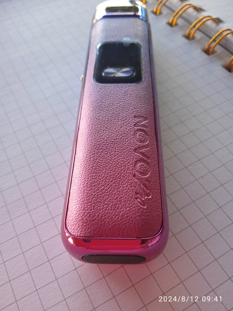 Зовнішнє Ново Про дуже схожий на Ново Мастер за виключенням екрану. Дисплей 0.42" з заокругленими краями розмістився трохи вище центру на лицевій стороні електронної сигарети. Його форма повторює форму самого пристрою, що виглядає дуже доречно та стильно. Горизонтальна овальна кнопка, розташована у нижній частині екрану, має приємний клік та неслизьке покриття. Нижче нанесений логотип з назвою моделі "Novo Pro". На одній бічній стороні корпусу знаходиться повзунок регулювання затяжки, а на іншій - зарядний роз'єм Type-C та брендування. Оскільки порт Type-C розміщено збоку, ви можете поставити девайс під час зарядки. Більш того, на дно пода Smok додали спеціальну силіконову підкладку, яка допомагає йому утримуватися на місці більш стійко.