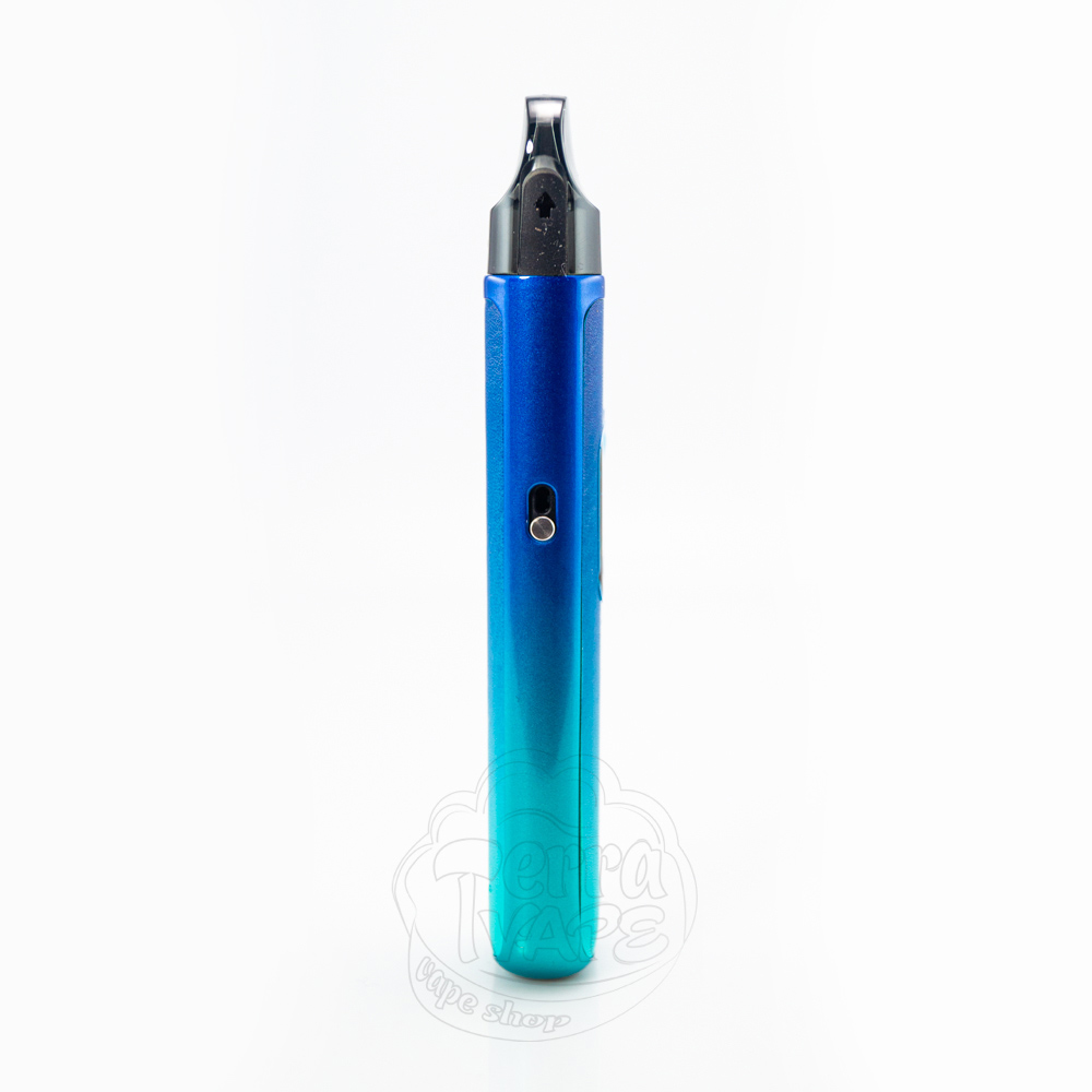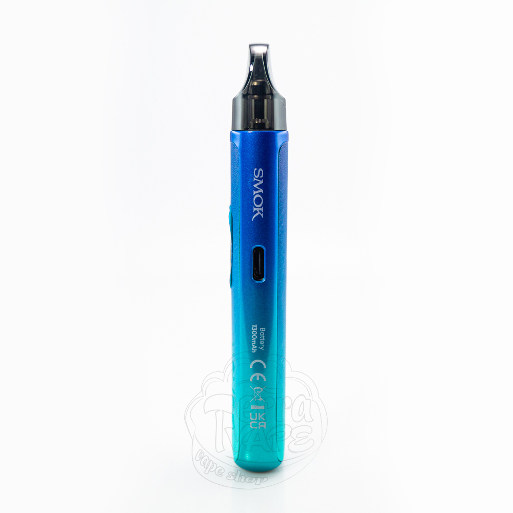 Внешне Ново Про очень похож на Ново Мастер за исключением экрана. Дисплей 0.42" с закругленными краями разместился чуть выше центра на лицевой стороне электронной сигареты. Его форма повторяет форму самого устройства, что выглядит очень уместно и стильно. Горизонтальная овальная кнопка, расположенная в нижней части экрана, имеет приятный клик и нескользкое покрытие. Ниже нанесен логотип с названием модели "Novo Pro". На одной боковой стороне корпуса находится ползунок регулировки затяжки, а на другой - зарядный разъем Type-C и брендирование. Поскольку порт Type-C размещен сбоку, вы можете поставить девайс во время зарядки. Более того, на дно пода Smok добавили специальную силиконовую подкладку, которая помогает ему удерживаться на месте более устойчиво.