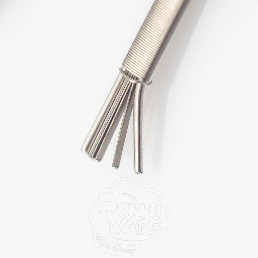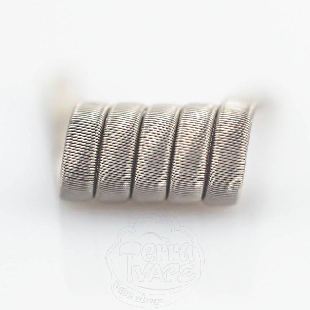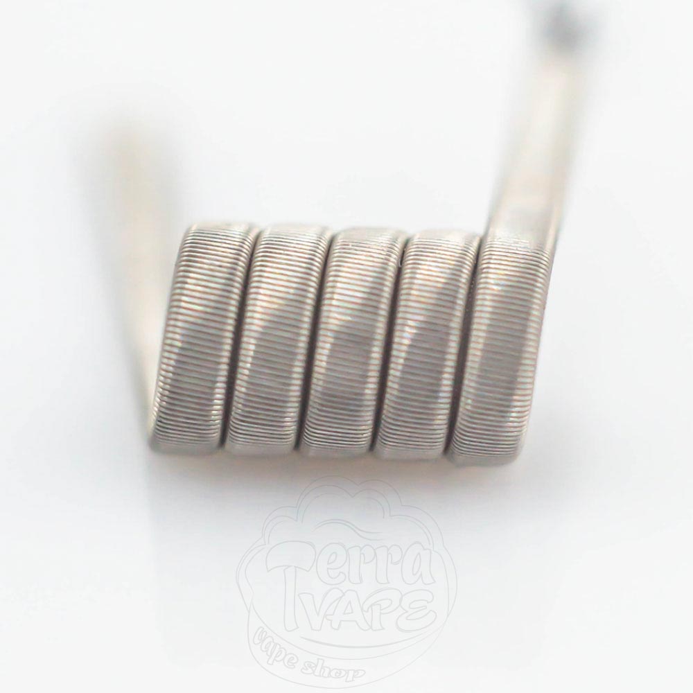Framed Staple Coil - это что-то среднее между обычным стейплом и фьюздом. Он состоит из уложенной плоской проволоки, обрамленной обычной круглой проволокой, обмотанными поверх более тонкой проволокой. Такая конструкция обеспечивает большую площадь испарения и отменную вкусопередачу.