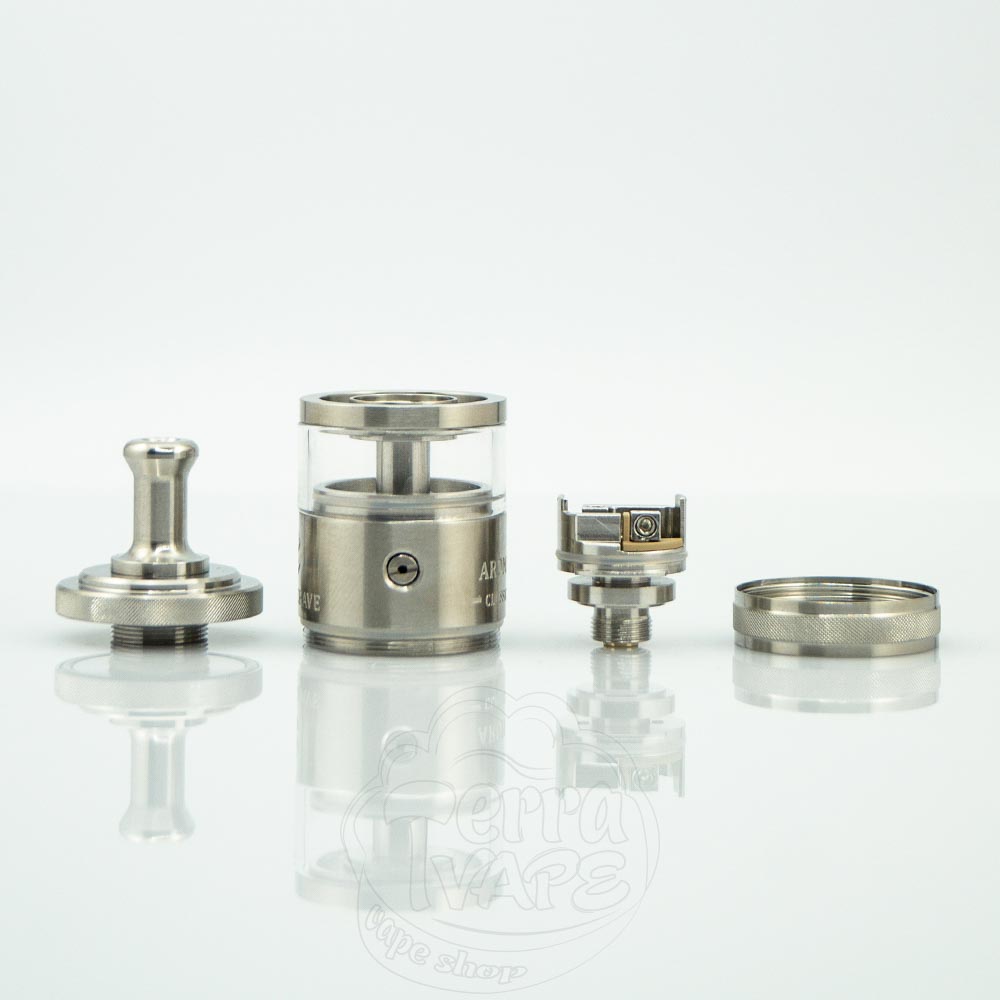 Бак выполнен из качественной нержавеющей стали в достаточно компактных размерах: высота от базы до дрип-типа 34.4мм, а диаметр 23мм. На основной части есть брендинг с логотипом и названием Steam Crave на одной стороне и "Aromamizer Classic MTL RTA" на другой. Выглядит аккуратно и ненавязчиво.