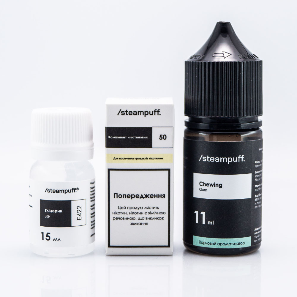 Steampuff Salt 30ml - это набор для самостоятельного приготовления солевой жижи от украинского производителя. Глицерин относится к пропилену как 50/50, поэтому эта жидкость отлично подойдет для маломощных девайсов, в том числе многоразовых под-систем. Говоря о крепости, она доступна в варианте 50мг/мл, что является наиболее распространенным и популярным выбором среди вейперов.