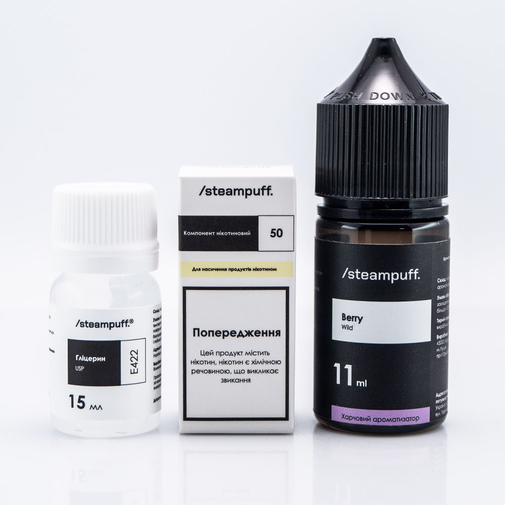 Steam Puff Salt 30ml - це набір для самостійного приготування сольової жижки від українського виробника. Гліцерин відноситься до пропілену як 50/50, тому ця рідина відмінно підійде для малопотужних девайсів, у тому числі багаторазових под-систем. Говорячи про міцність, вона доступна у варіанті 50мг/мл, що є найбільш поширеним та популярним вибором серед вейперів.