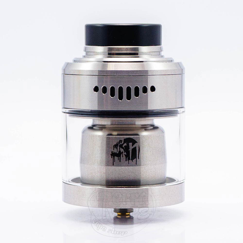 Suicide Mods Nightmare XL RTA Stainless Steel - це масивна, збільшена версія обслуговуваного баку Nightmare, сріблястого кольору від компанії Suicide Mods. Діаметр бази складає 40мм. Об'єм з прямим склом 12мл, а з бабл - 15мл. Дека прийме на себе дві спіралі. Обдув, що можна зрегулювати обертаючим кільцем, верхній, як і заправка. 810 дріп-тип можна зняти та замінити.