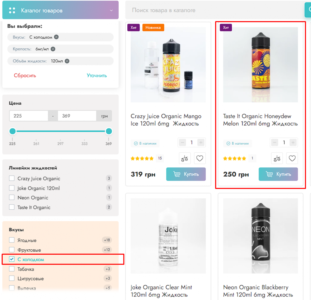 Хочу обратить внимание что при выборе жидкости через фильтр выставил "С холодком", 120 мл., 6 мг никотина.