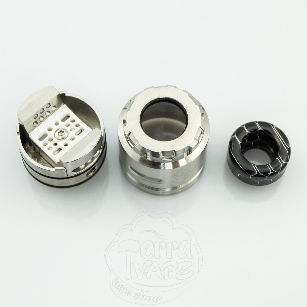 Tauren Max поставляється зі стандартним позолоченим 510 піном, але в комплект також входить BF пін, який добре виступає, тому проблем з використанням на механічному моді не виникне. Метал на RDA товстий, що робить її переконливо важкою, а обробка настільки чиста, що якість збірки дуже вражає.