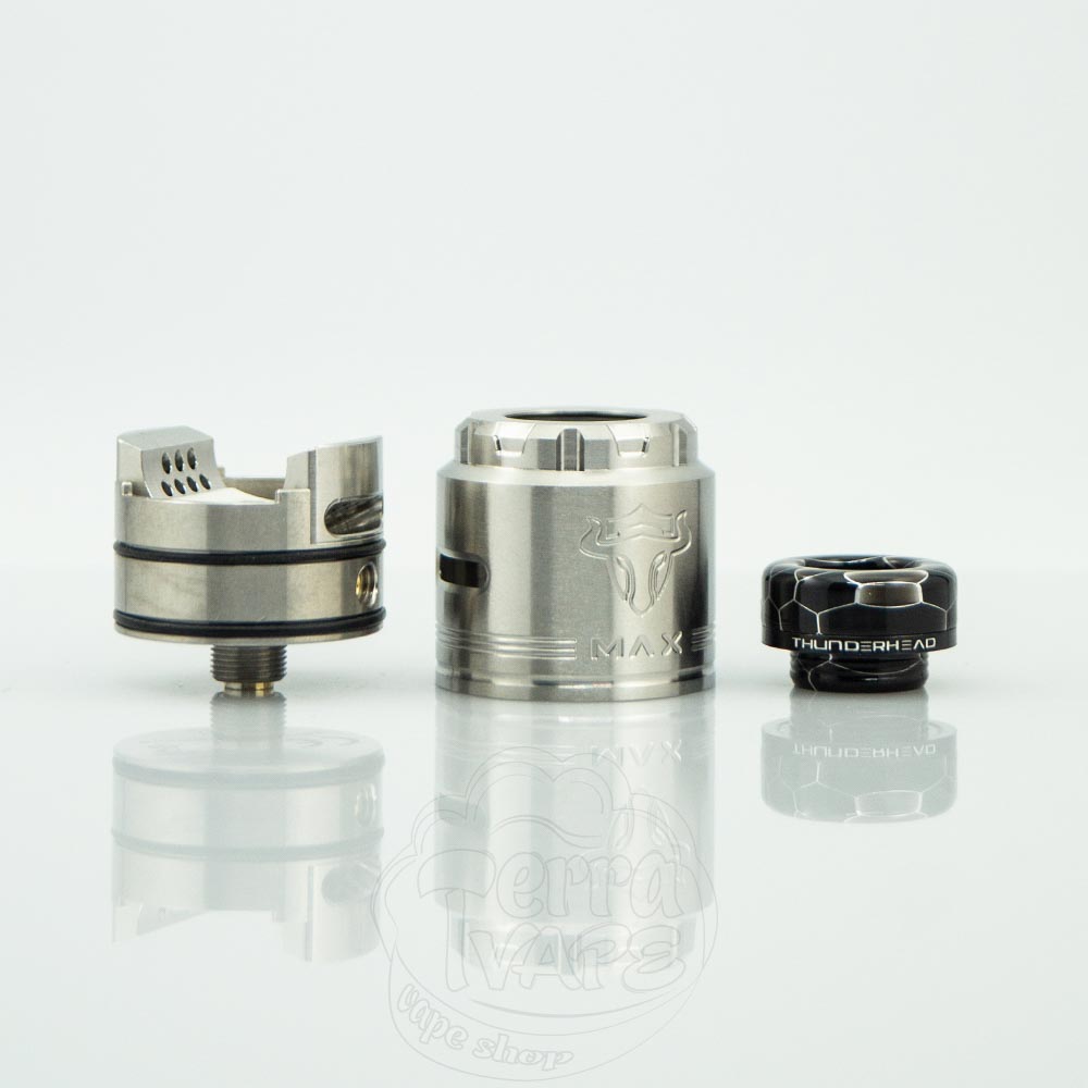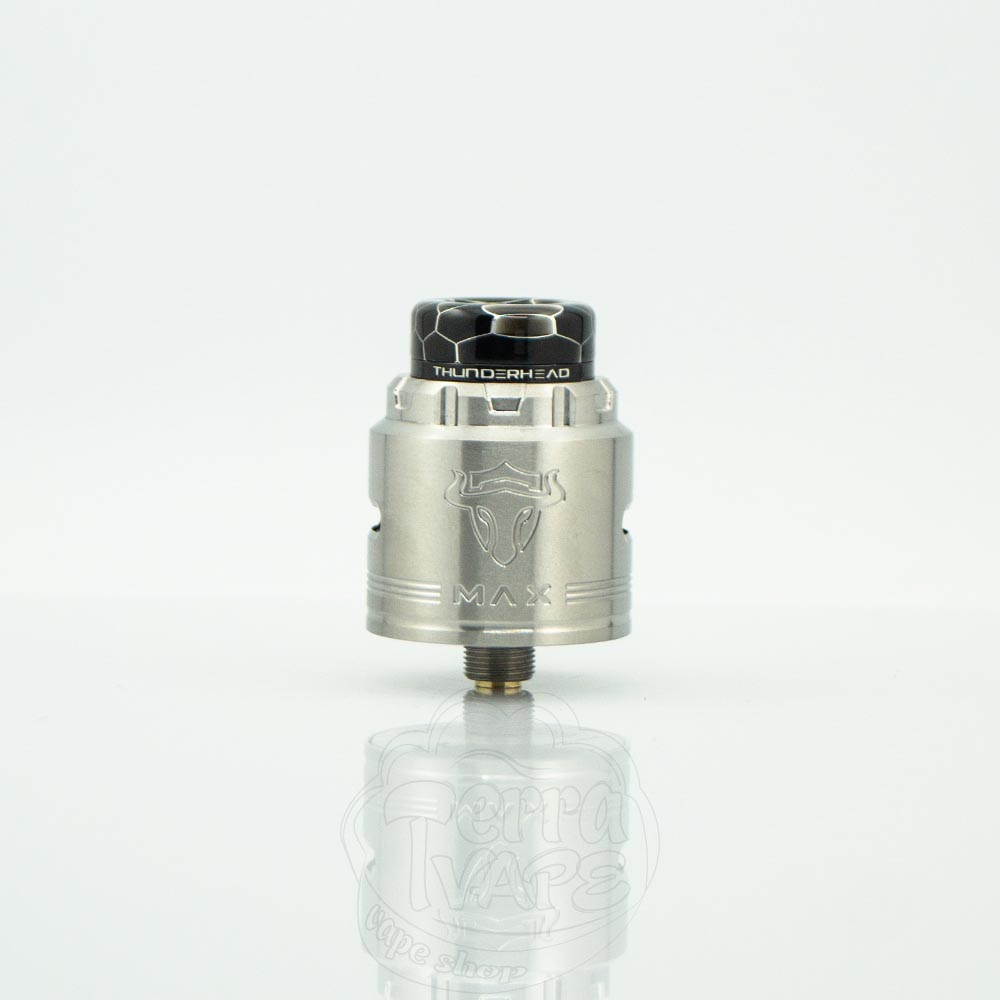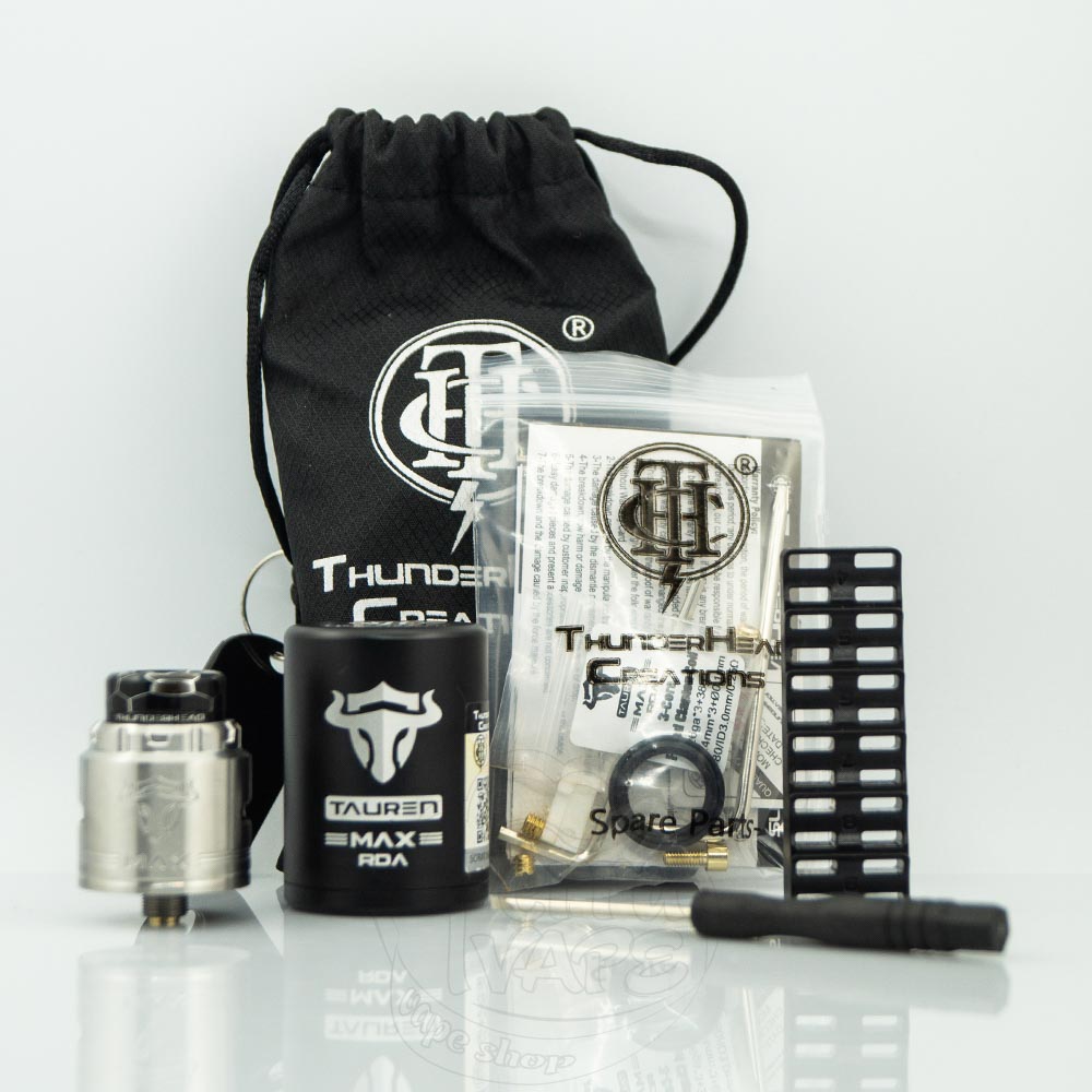ThunderHead Creations Tauren Max RDA – це двоспіральна дріпка від популярної вейп-компанії THC. Діаметр бази – 26мм. Обдув спіралі – бічний та нижній. Дека виконана з кераміки та має унікальну конструкцію для комфортної установки койлів. Відмінний атомайзер для випуску великих хмар пара.