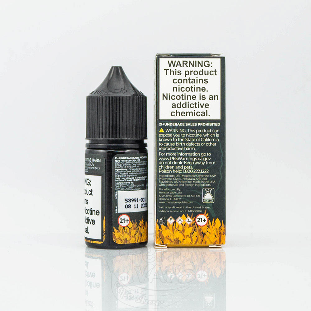 От создателей Jam Monster и Fruit Monster мы представляем вам Tobacco Monster. Вы соскучились по утренней сигарете с кофе? Tobacco Monster Salt обладает подлинным вкусом, который оставит вас довольным и готовым к началу дня. Выпускается в объеме 30мл, а крепость, уже по традиции, - 24мг/мл или 48мг/мл. Соотношение глицерина к пропилену соотносится 50/50, что обеспечивает идеальную густоту для использования с многоразовыми pod системами или другими маломощными электронными сигаретами, как например MTL-баки.