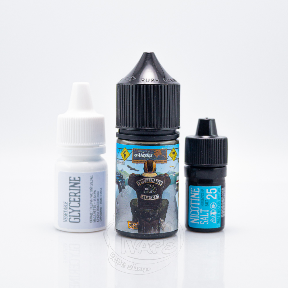 Troublemaker Salt 30ml - це набір для самостійного приготування сольової рідини від українського виробника LiqLab. Випускаються в об'ємі 30мл і в двох опціях міцності: 25мг/мл або 50мг/мл. Використовуваний бустер досить м'який і не перебиває аромат. Співвідношення VG/PG - 50/50.
