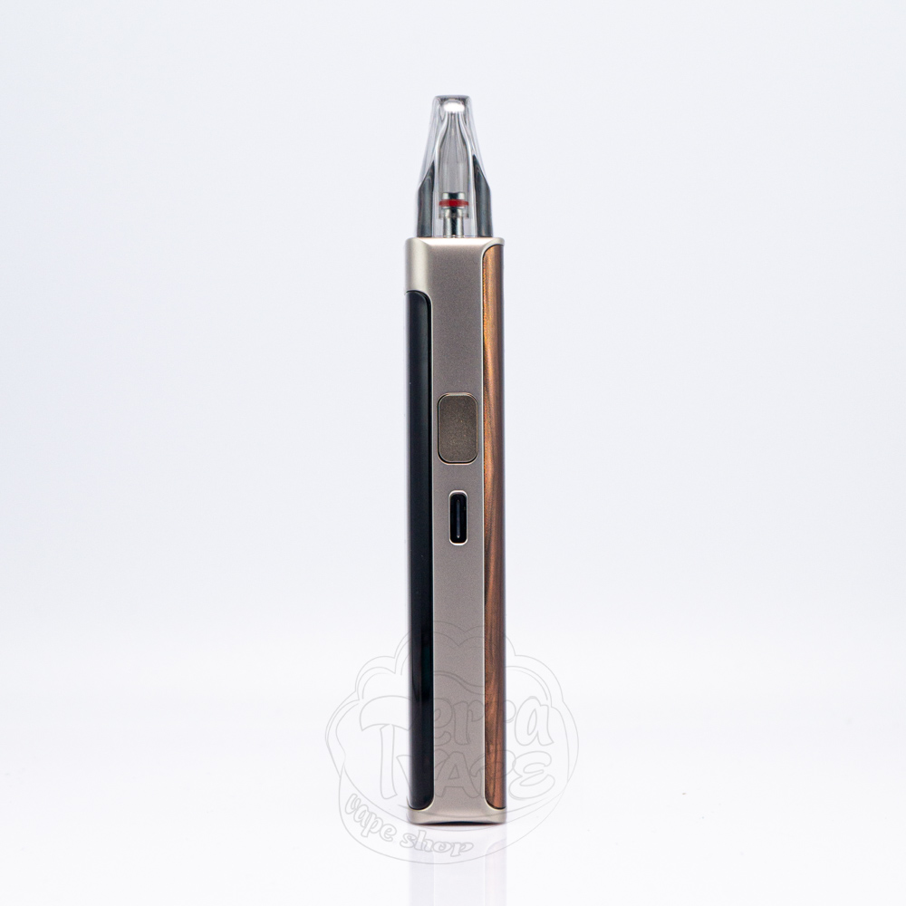 З лівого боку знаходиться регулятор затяжки, а на протилежній стороні можна побачити зарядний роз'єм Туре-С та ледь виступаючу кнопку активації. По корпусу в різних місцях розкидані логотипи бренду та самої моделі. Вони лаконічно вписані у дизайн та не кидаються в очі, зосереджуючи всю увагу на основних елементах.