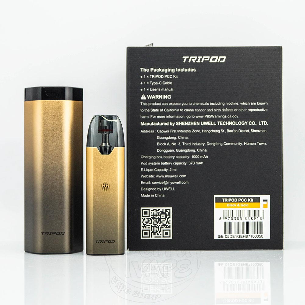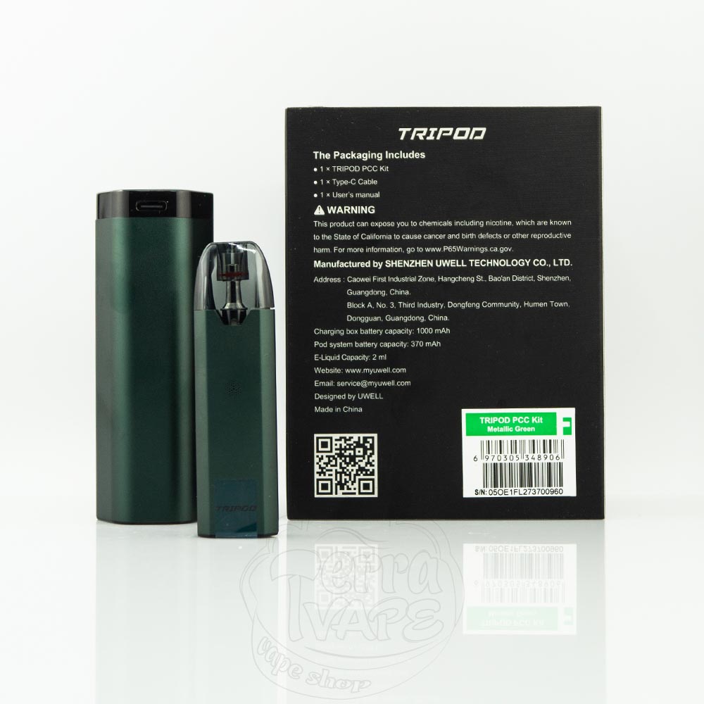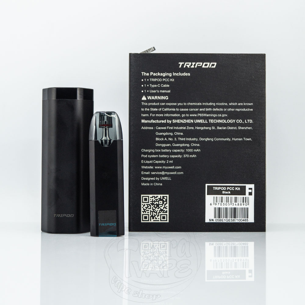 Uwell Tripod PCC Pod Kit 370mAh+1000mAh – это под система с комплектным зарядным чехлом, который также вмещает два дополнительных картриджа от компании Uwell. Кейс имеет аккумулятор емкостью 1000мАч, а девайс – 370мАч. Картридж вмещает 2мл жидкости для электронных сигарет и имеет сопротивлением 1.2Ом, что отлично подходит для MTL-парения. Великолепный набор для тех, кто ищет автономное устройство с сигаретной затяжкой.