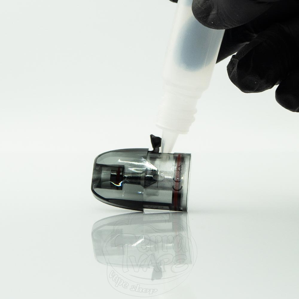 Чтобы заправить картридж Tripod необходимо открыть боковую заглушку и залить жижу внутрь. Лучше всего использовать жижу на солевом никотине или любую другую с соотношением VG/PG 50/50 или 60/40, чтобы хлопок успевал пропитываться.